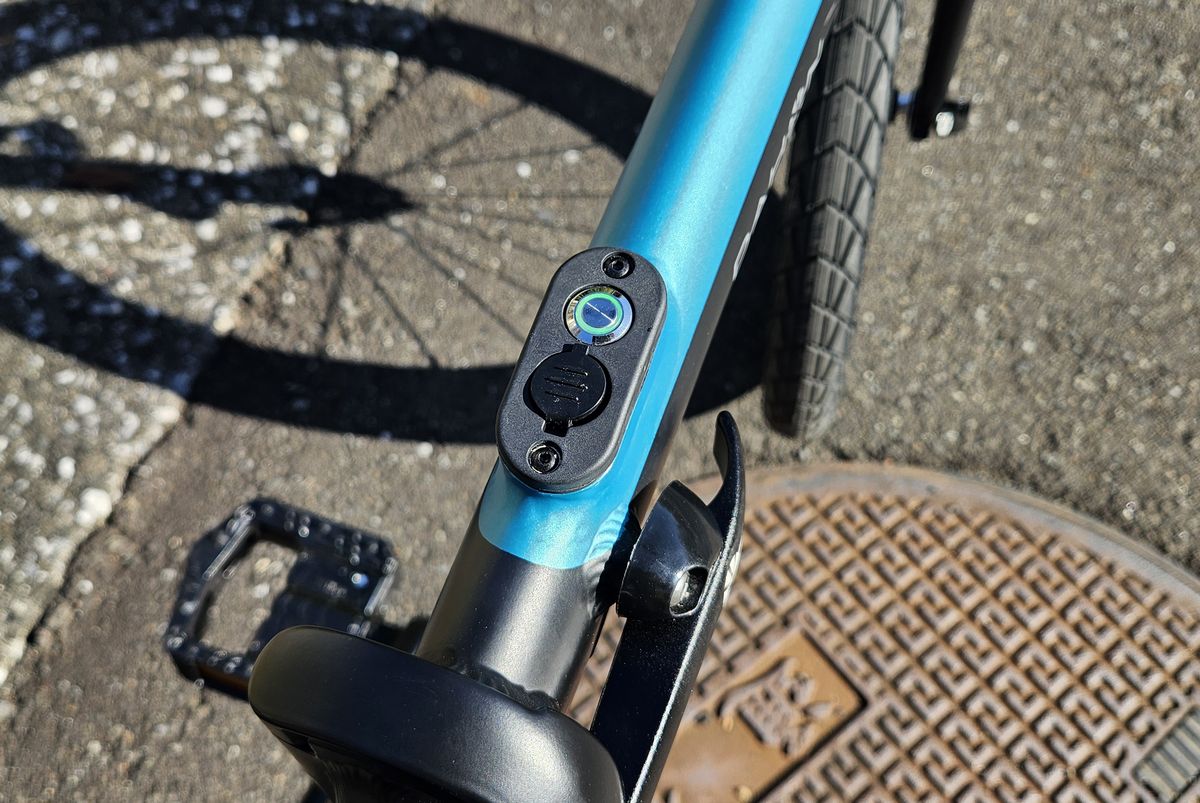 スイッチ類はトップチューブに電源スイッチがあるのみ。そばに充電ポートもあります。