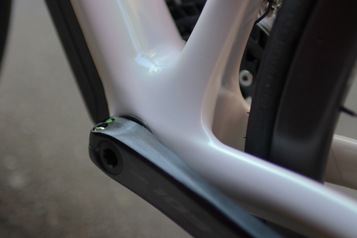 横幅のあるダウンチューブは大口径のベアリングを使用したBBに繋がり、横剛性を最適化します。