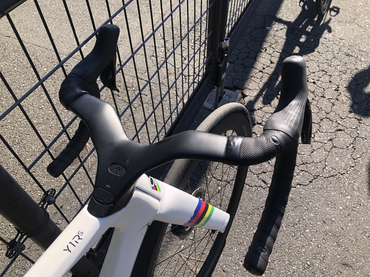 名前の由来にもなっているY字型のハンドル「CC.Y1」。ガルウイングのような形状でスタックを確保しつつ、通常の一体型ハンドルを超える前方投影面積削減を実現。レバー部の幅は377mmで狭すぎず広すぎず、コントロールはしやすかったですが、ドロップは130mmとやや大きめなのは好みが分かれるかと。最近は360mm以下などの超狭いハンドルを使っているユーザーも多いので、専用ハンドル以外は取り付け出来ない自由度の低さは難点と言えます。