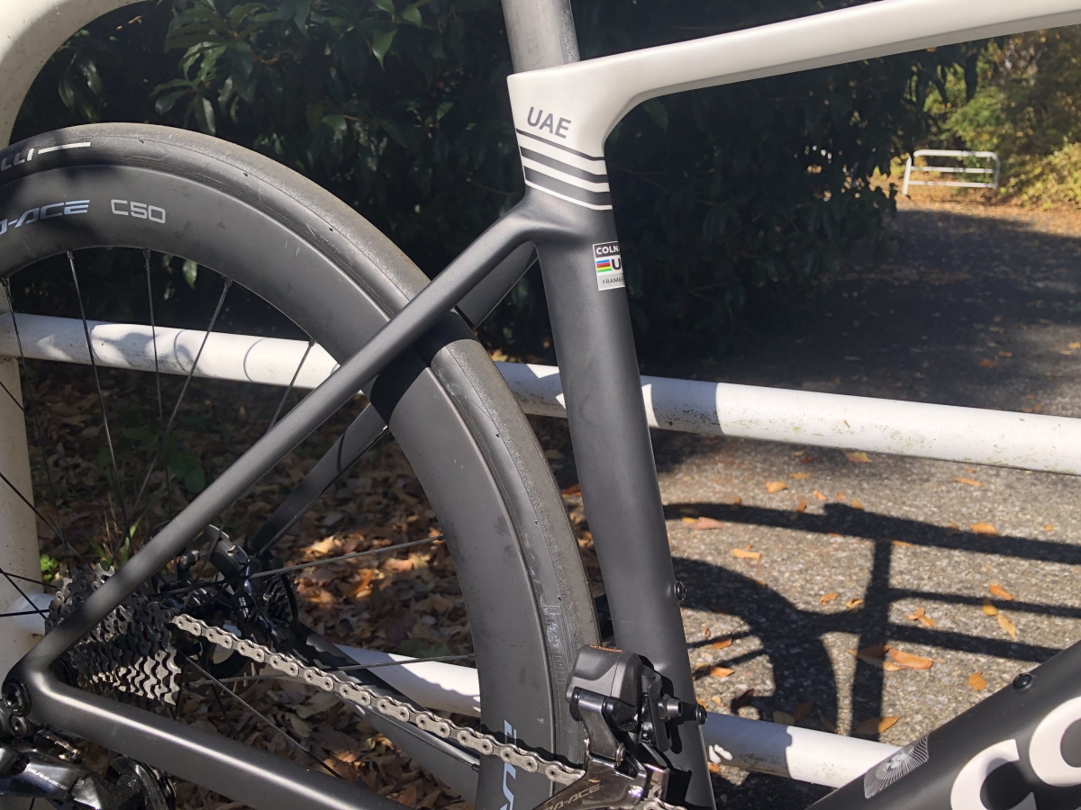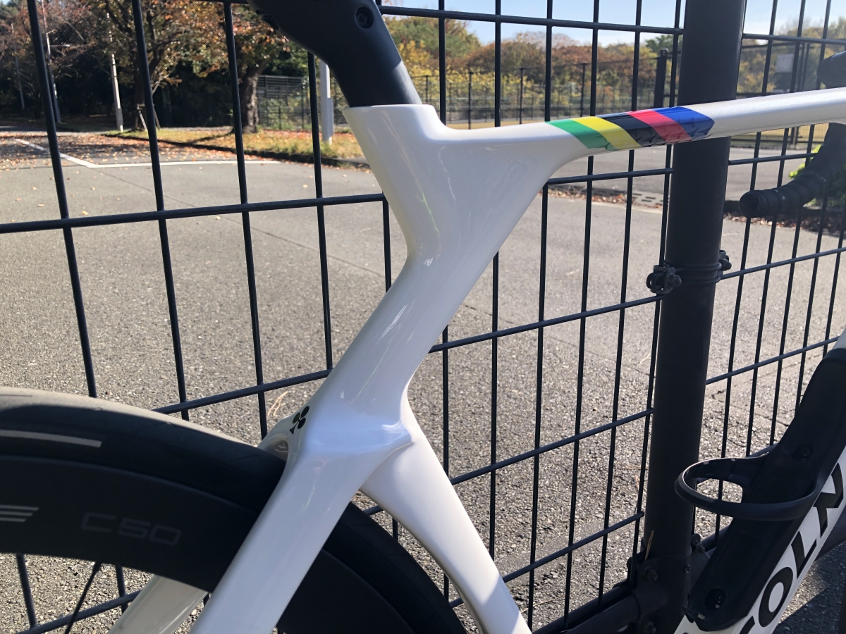 まず、前作に比べて明らかにヘッドチューブ・フロントフォークが細くなっています。フォークコラムやブレーキホースを中に通す以上、物理的に細くできる限界近くまできていると言ってもいいと思います。ハンドルこそCC.01のままですが、フロントセクションの改善は確実に空力を高めていることでしょう。