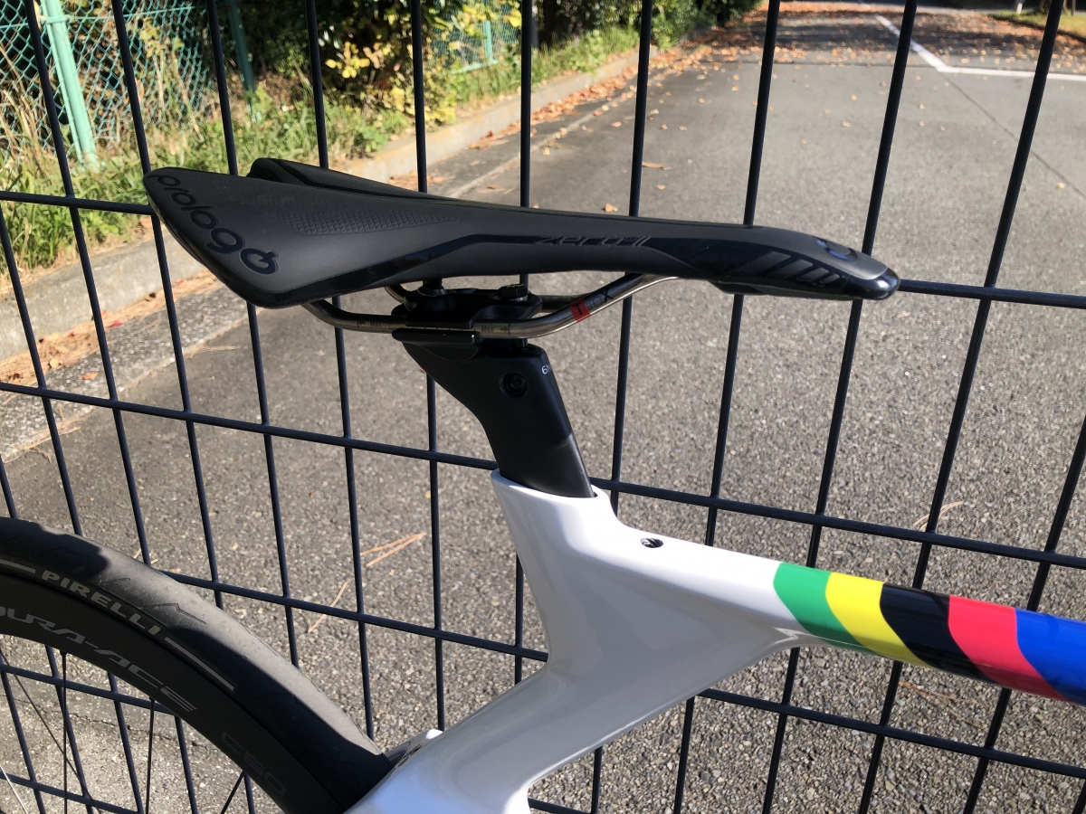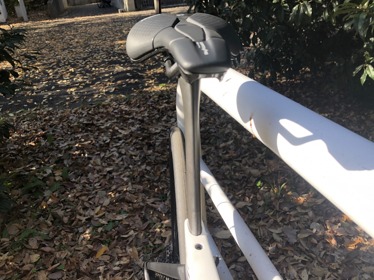 フレームの構造上、シートポストの差し込み量が少なく、サドル高の調整幅はわずか15mm程。組付けはシートポストカットが必要なのである程度自分のサドル高が固まっている人向きのバイクになります。