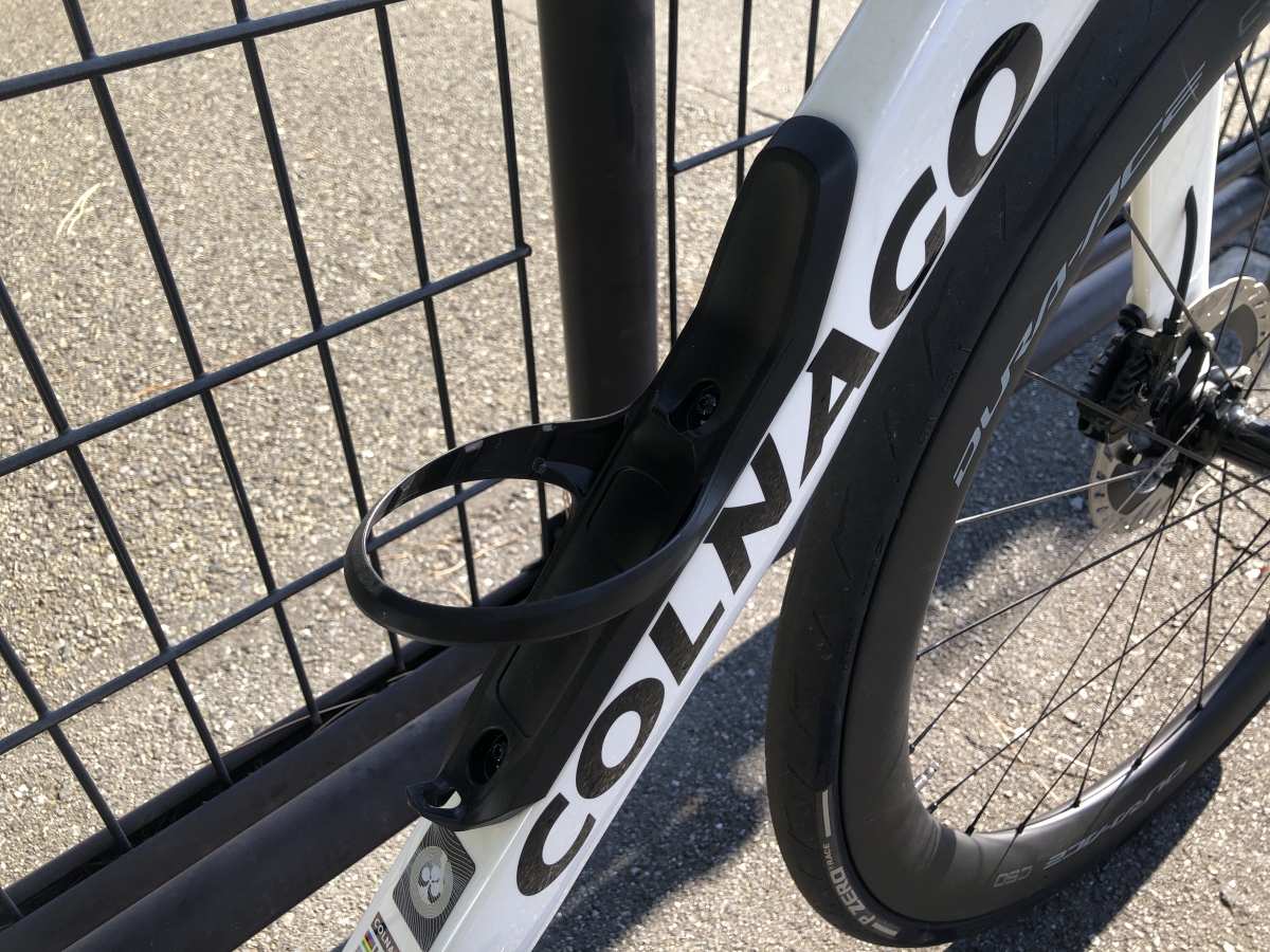 専用のエアロボトルケージを使うことでダウンチューブ周辺の空力をブースト。最近はボトルも専用品を使うメーカーが増えていますが、こちらは通常の丸ボトルに最適化されているようです。ちなみにこのボトルケージ上部の下からDi2のバッテリーを収納する仕組みになっています。