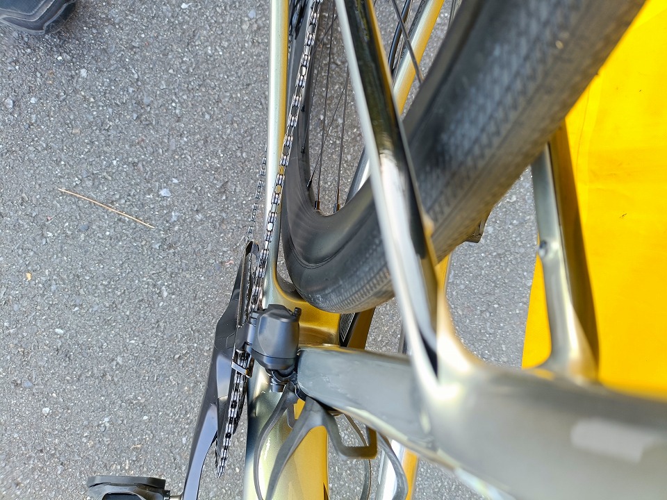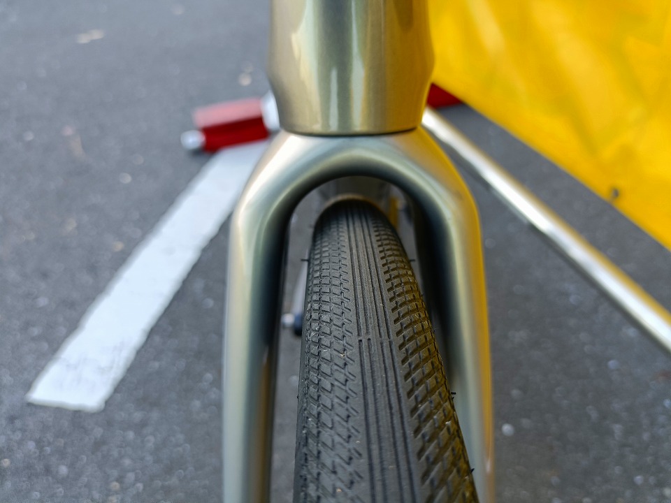 カタログにある通りタイヤクリアランスは余裕がありますので、少し荒れた区間(アスファルトが割れたまま放置されている)を走るサイクリングなら35C程度のタイヤを履かせてみたいです。