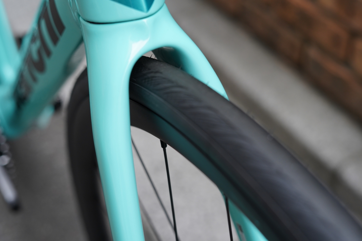 最近のバイクは30Cのような太めのタイヤを装備することを想定し、広めのタイヤクリアランスを確保。デフォルトのタイヤサイズは28Cです。