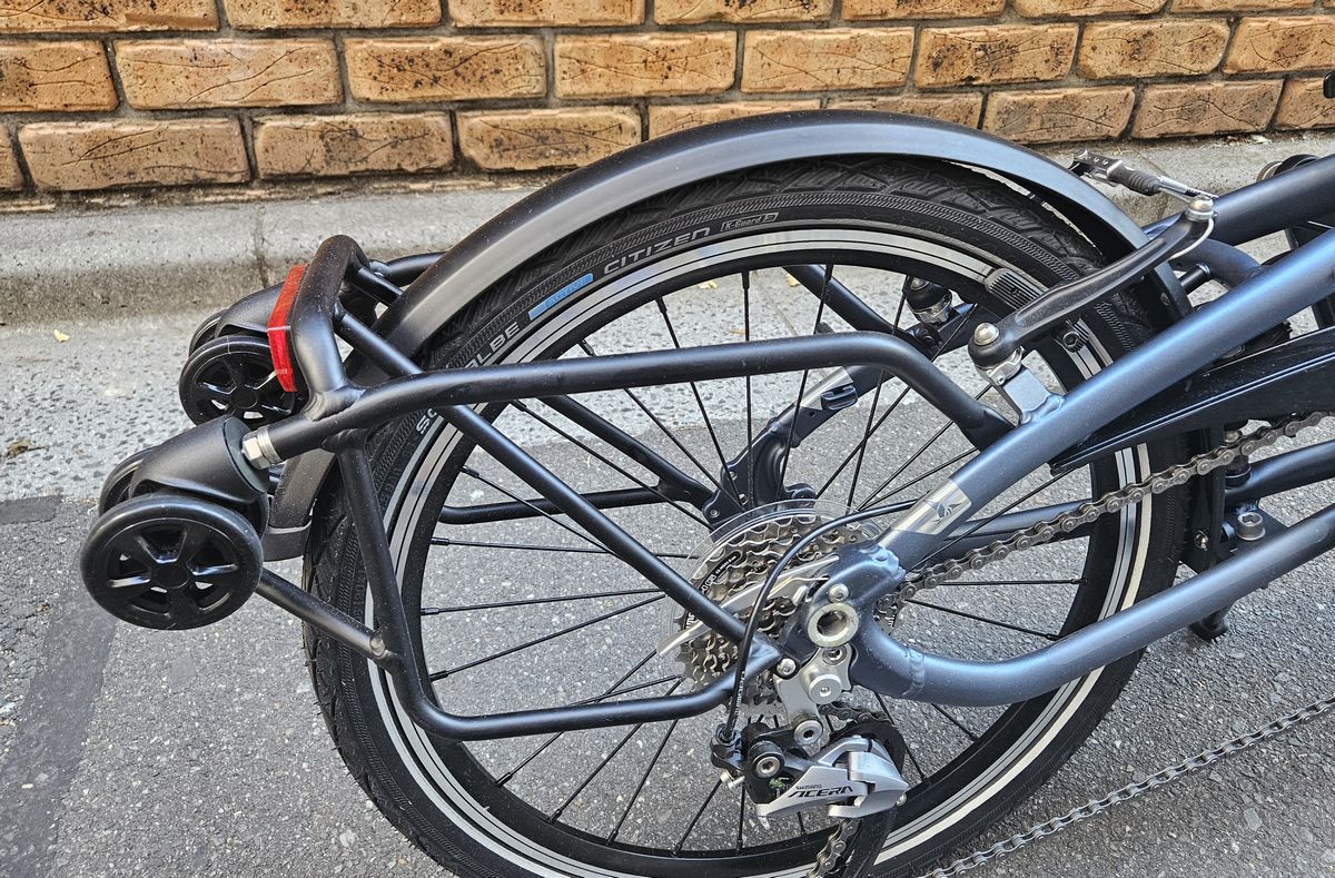 リアキャリア後部に設けられたキャスターローラーにより、畳んで縦置きした際の自立安定性の確保と、移動時に転がして持ち運ぶことが可能です。