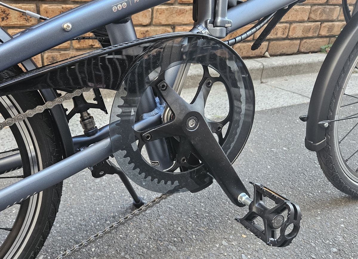 ノンドライブ側のペダルは三ヶ島製の着脱式「Ezy」タイプを使用しており、外した際はチェーンステー部のペダルマウントに収まる仕様となっています。