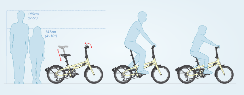 2段階に伸縮するシートポストとハンドル位置調整システム(どちらも後述します)により様々な方にジャストフィットします。
