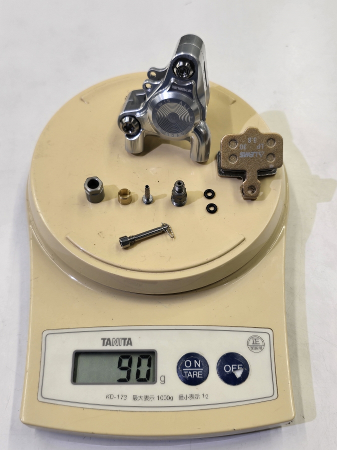 インストールには同梱のコネクトボルトやオリーブを使用します。ブレーキパッドを含めた使用パーツトータルの重量で90gでした。