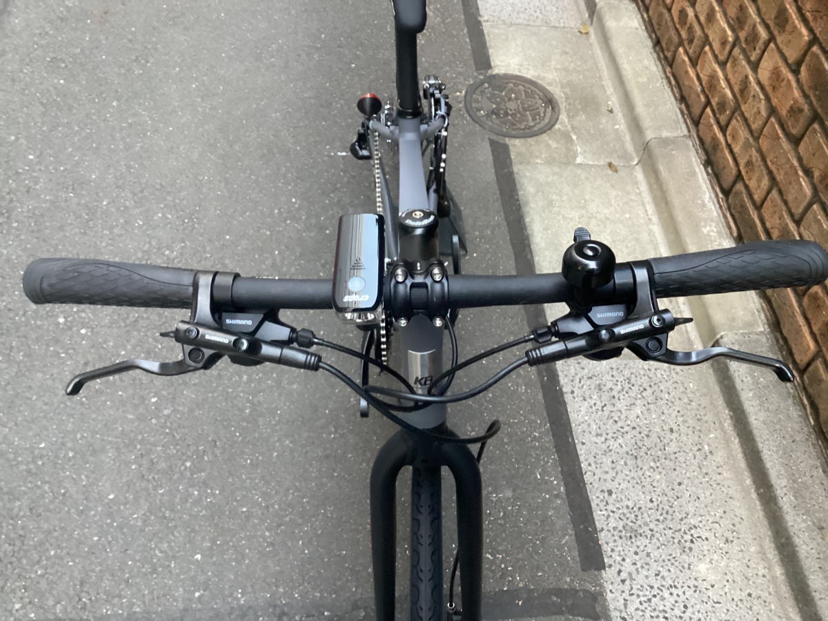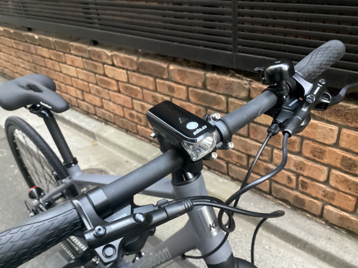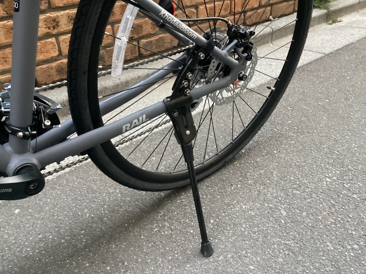 クロスバイク必須のアイテム、フロントライト、キックスタンド、ベルが付属