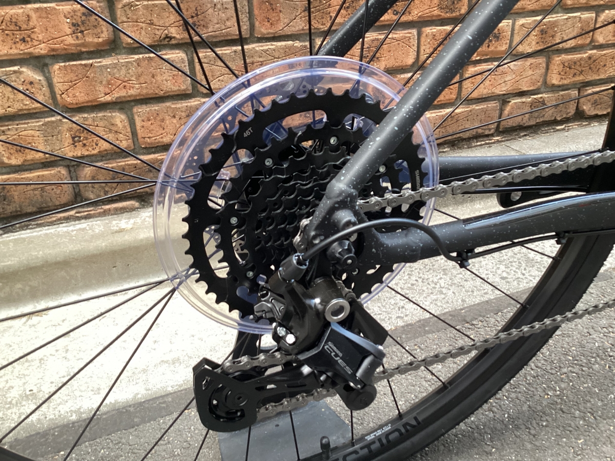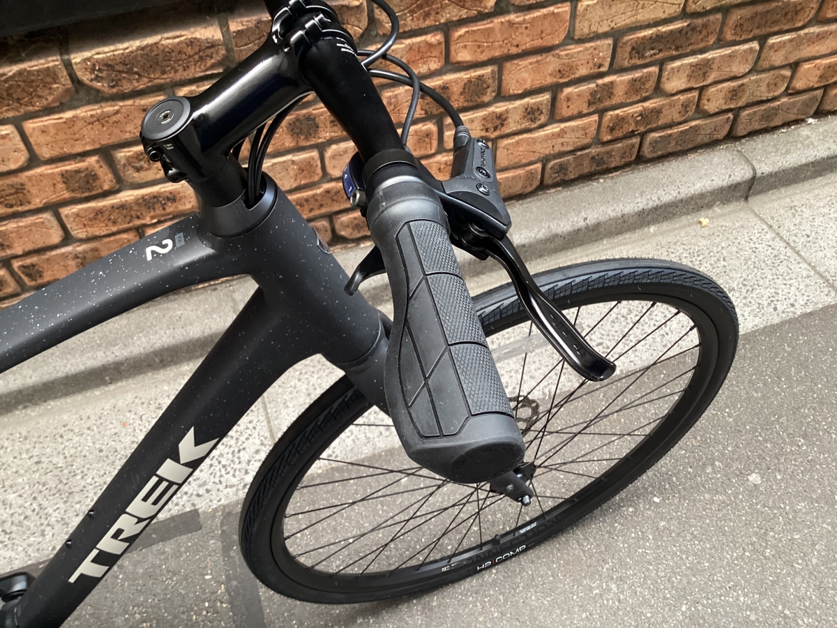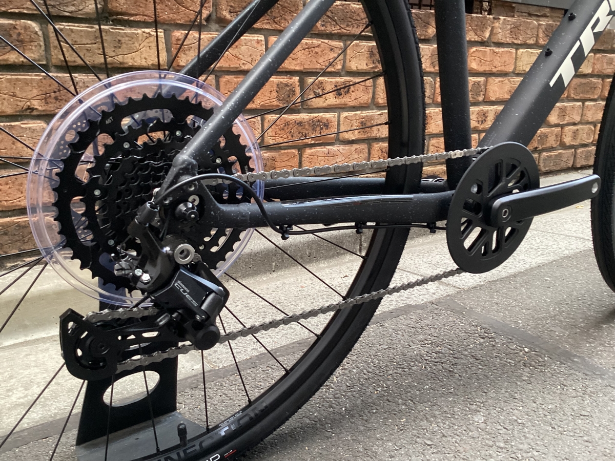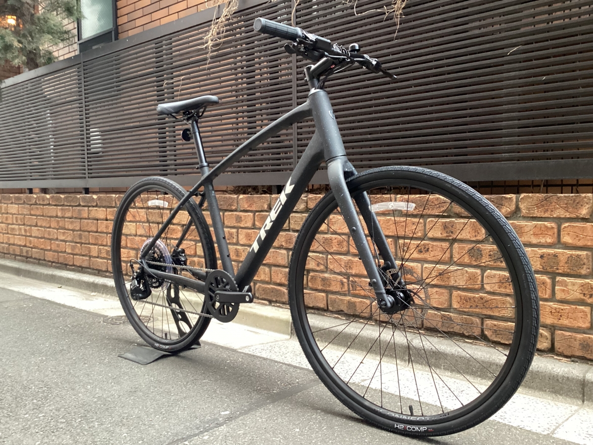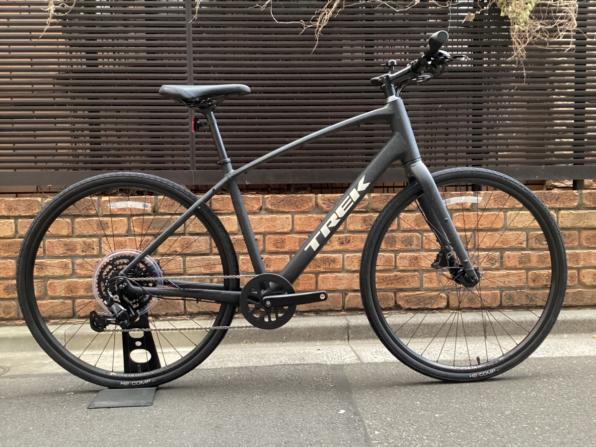 FX2はアルミフレームにアルミフォーク、テクトロ製の油圧ディスクブレーキを採用したモデル。ギアは後ろ9段ギアになります。タイヤは700×35CボントレガーH2 COMPハイブリットタイヤ。街中での使用を考えられ開発されたモデル。コーナリング時のグリップ力もありながら高い耐久性があります。ギアはシマノCUES U4000。スプロケットやチェーンは従来のモデルに比べ、耐久性が大幅に向上しました。