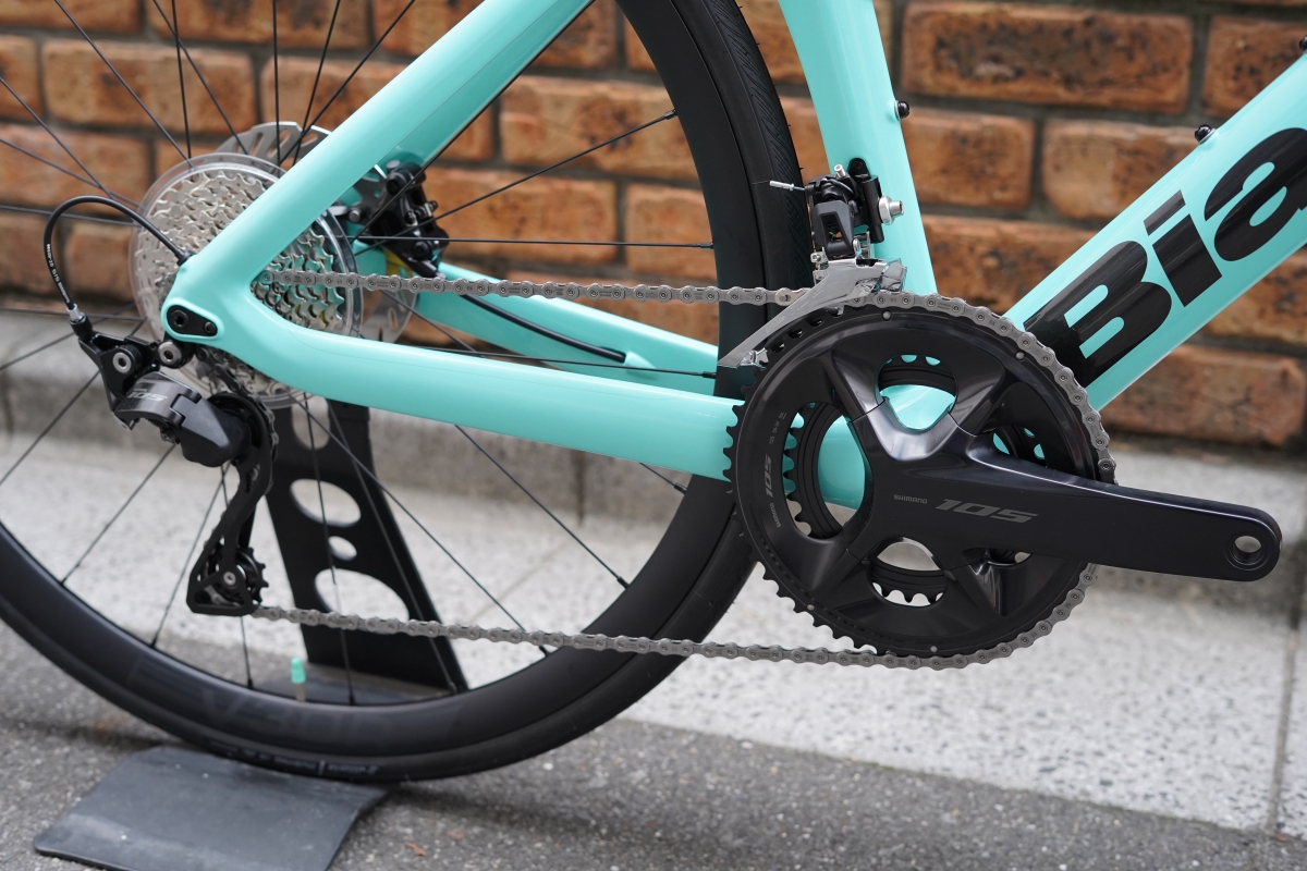 コンポーネントはあらゆるレベルのライダーに対応する中核グレード「105」を搭載。ワイドなギア比で平地から登りまでどんな地形にも対応可能。