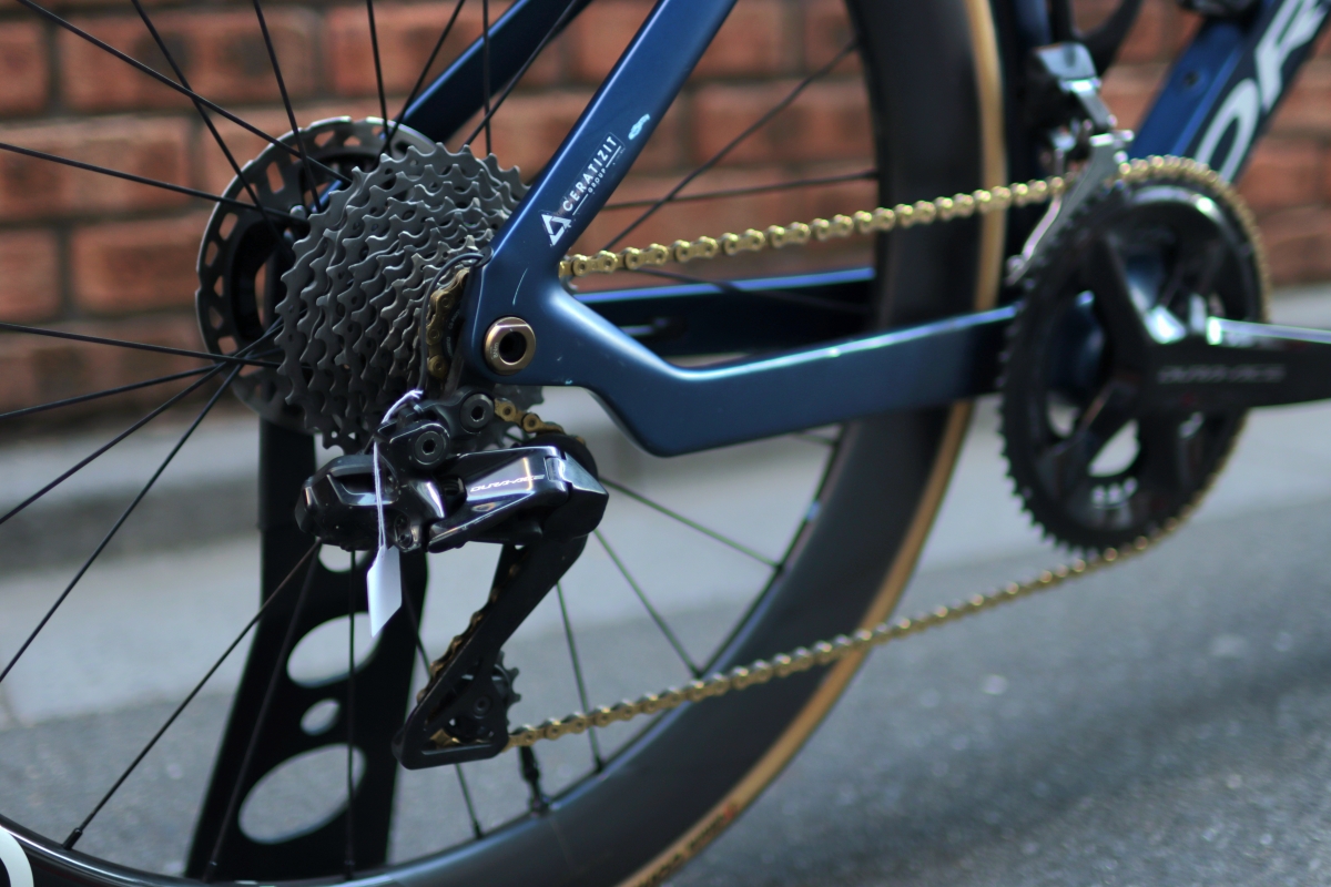 フルDURA-ACE、カーボンディープホイール、レーシングサドルと完全体。ゴールドチェーンでアクセントをプラス。