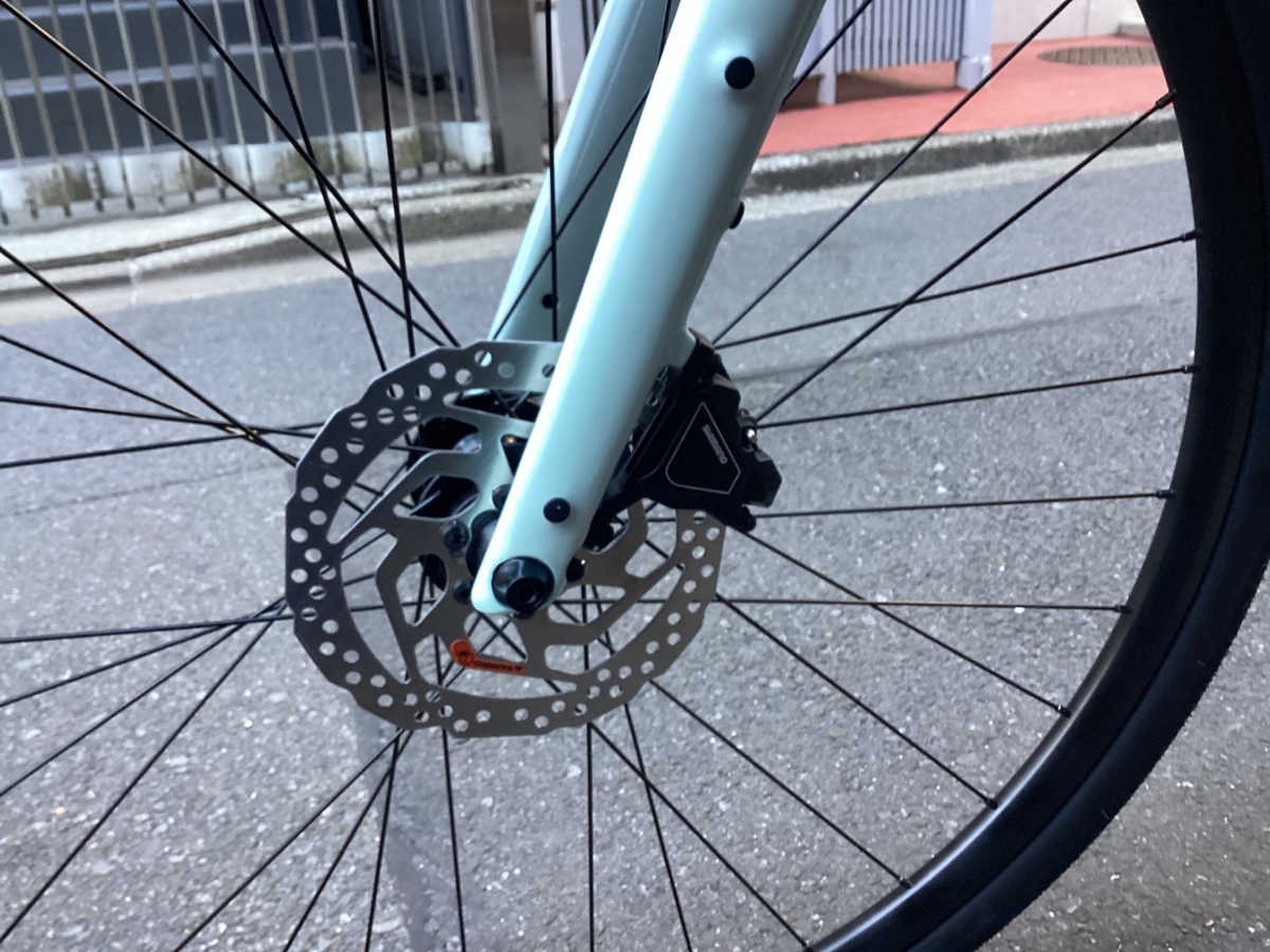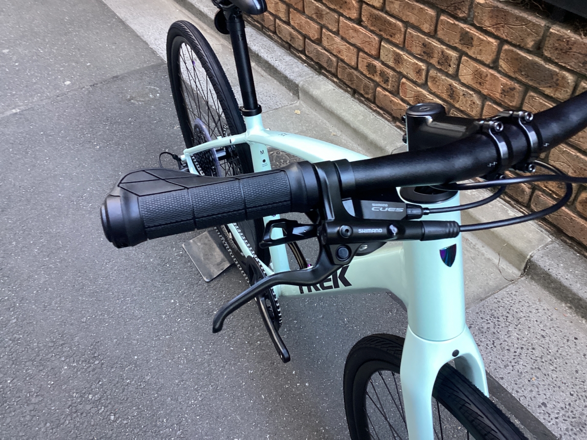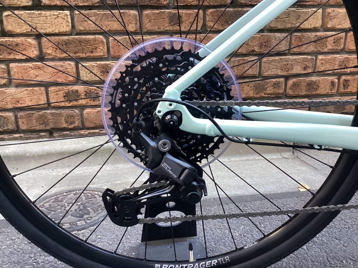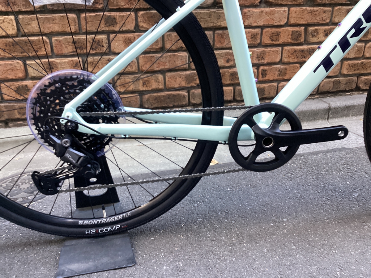 FX3はFX2と比べフレームがグレードアップ。アルミフレームにカーボンフォーク仕様。そして油圧ディスクブレーキはテクトロからシマノ製へ。よりかっちりとしたブレーキの制動力がえられます。変速段数はリア9速(11-46)から10速(11-48)に。フロントチェーンリングは変わらず40T。タイヤも変更なく700×35CボントレガーH2 COMPハイブリットタイヤ。街中での使用を考えられ開発されたモデルです。コーナリング時のグリップ力もありながら高い耐久性を確保。フレームの最大タイヤクリアランスは700x40mm。ギアはシマノCUES U6000。CUESに使用されるスプロケットやチェーンはLINKGLIDE規格になり、従来のパーツに比べ耐久性が大幅に向上しました。