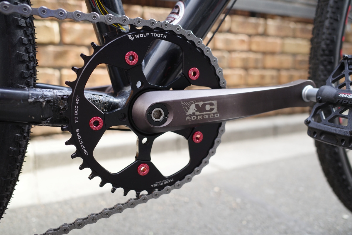 BCD110の5アームで良いものは?と探し、MAID IN USA のWOLF TOOTHを選択。たわみの無いしっかりした剛性、チェーン掛かりの良い精度でかつ高級感のあるルックスも魅力です。