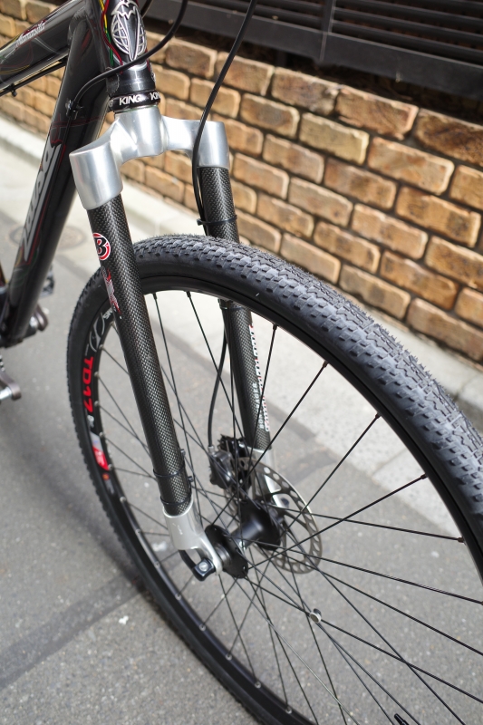 更にお客様手持ちのカーボンフォークも投入!元フォークは2キロ強の重さがあるエントリーグレードのエアサスでしたので、