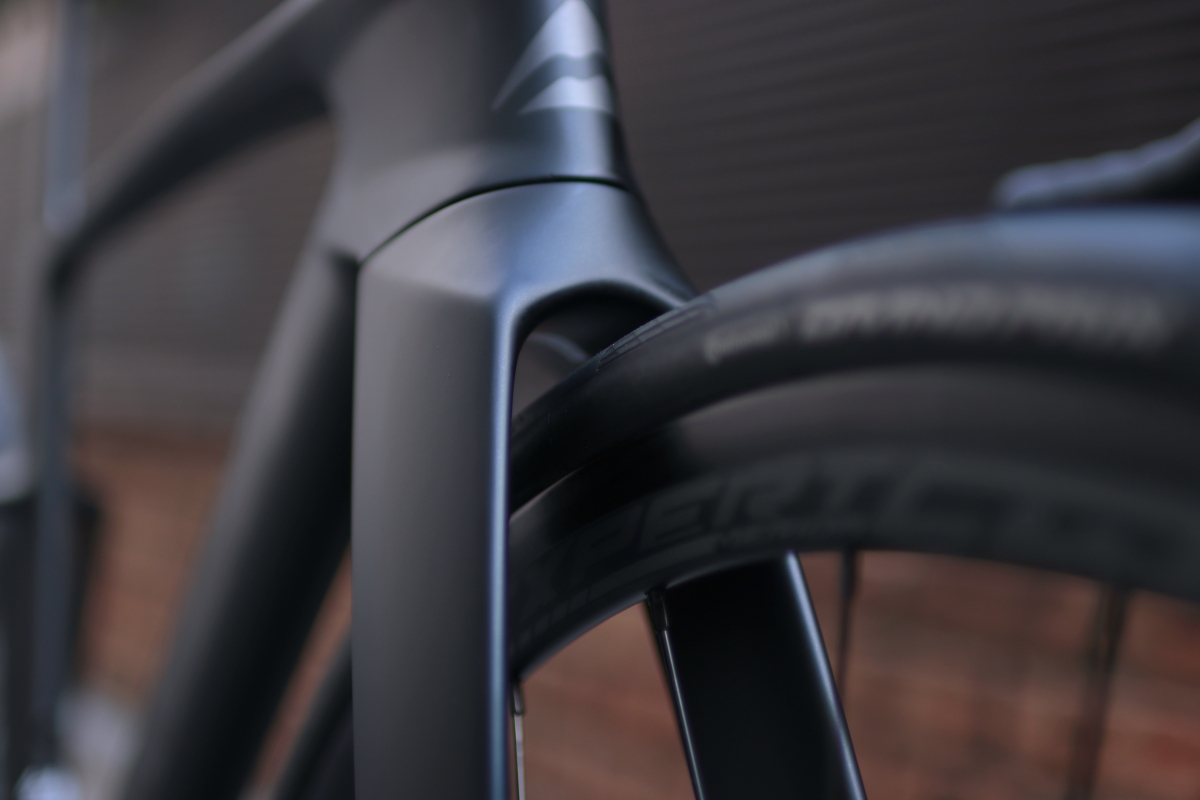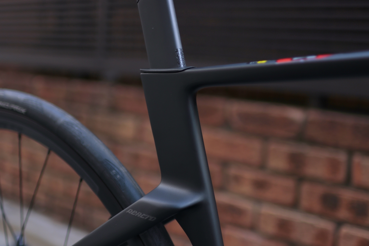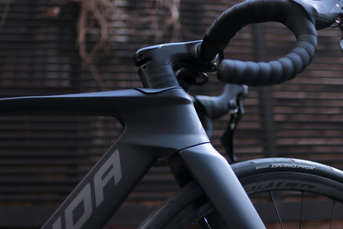 UCI規定の改定によりヘッド周りの設計に自由度が増したので、TTバイク顔負けの深いヘッドチューブを有しています。
