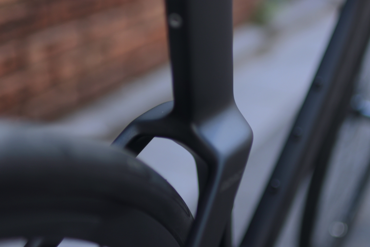 清流作用の高そうなフロントフォークはヘッドチューブに段差無くつながるようなデザインになっています。