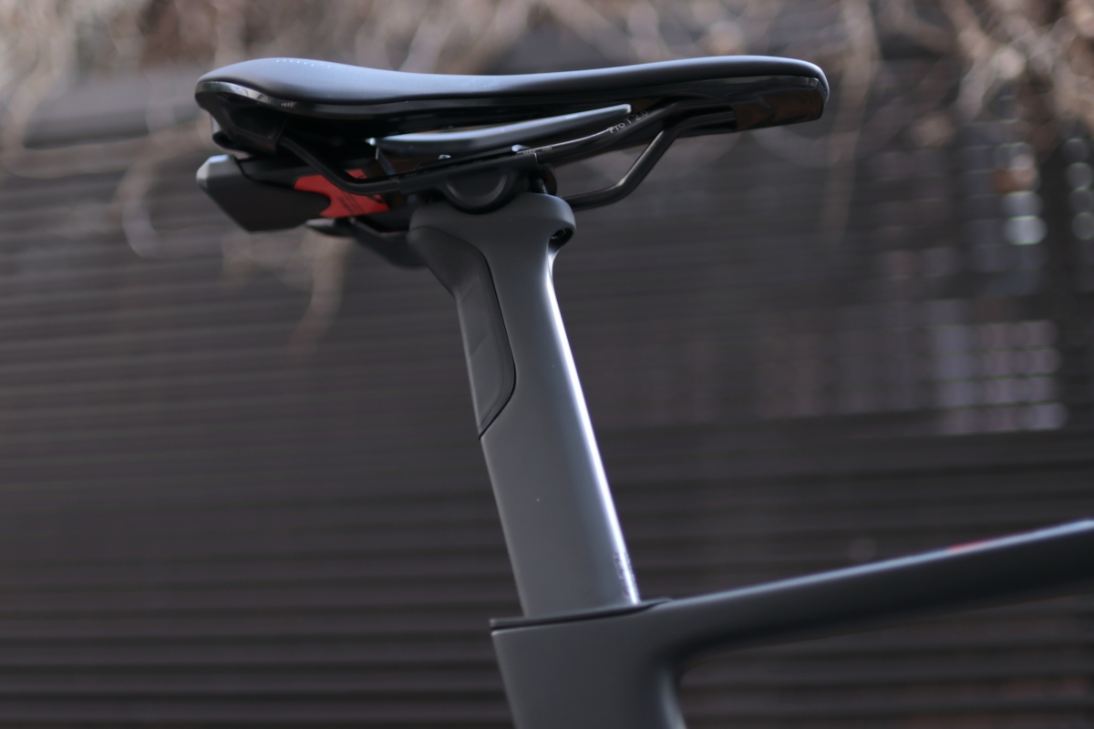 シートポストは従来よりもさらに薄型化し空力的になりました。Di2のバッテリーはフレーム下部からの挿入になったことで低重心化も進みました。