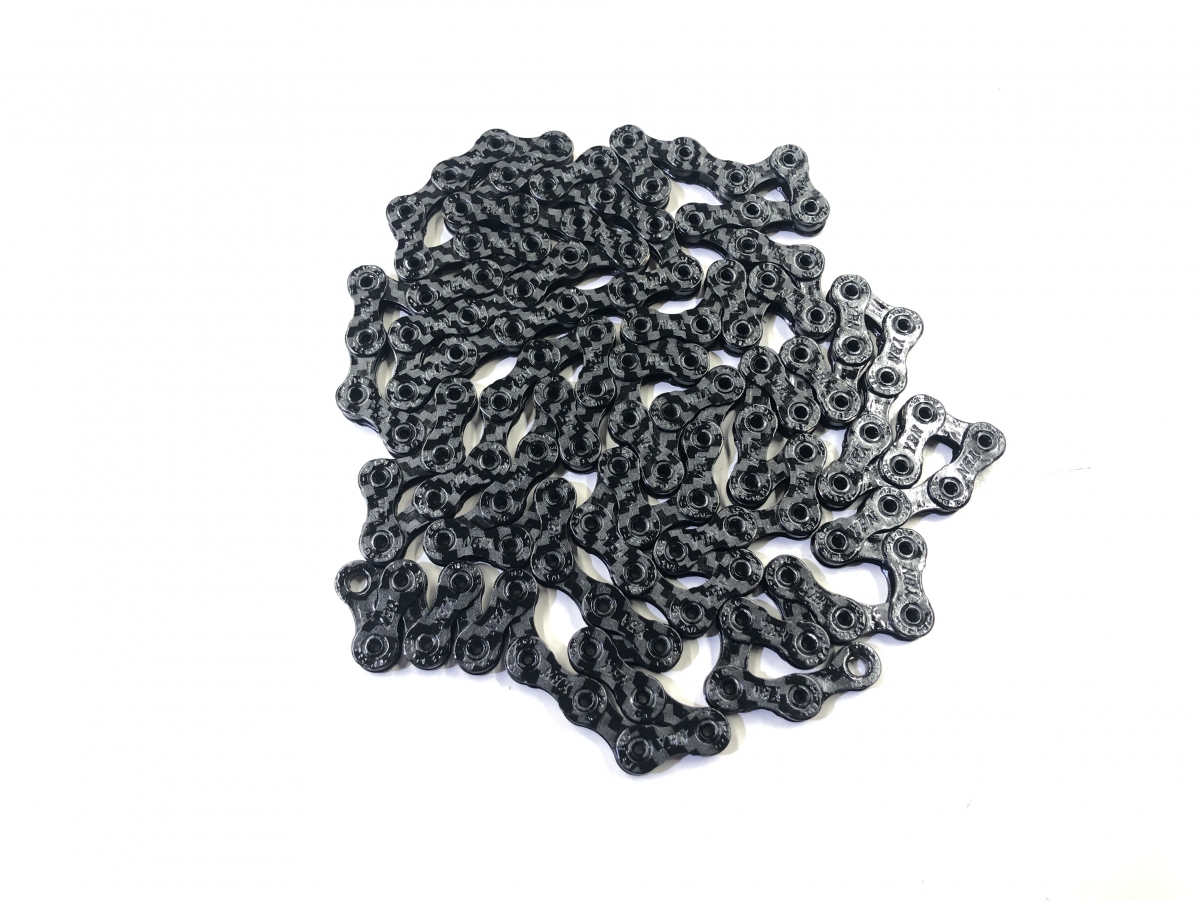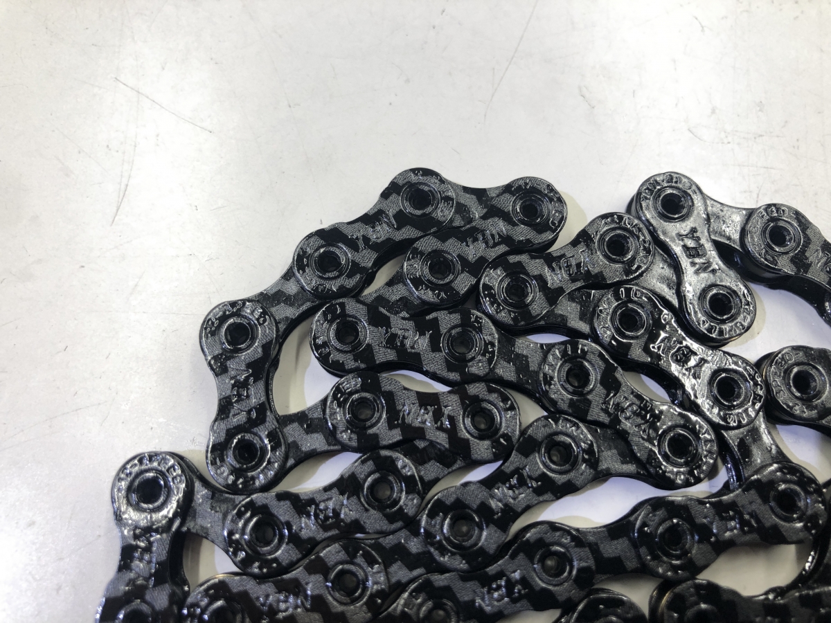 まさかのカーボン製チェーン!?と思うかもしれませんが、これはプレートの素材がカーボンというわけではなく、あくまでカーボン柄がプリントされているだけ。近くで見てみると明らかにカーボンの質感とは異なっているのが分かりますが、遠目には本物のカーボンっぽく見えるというのがポイント。