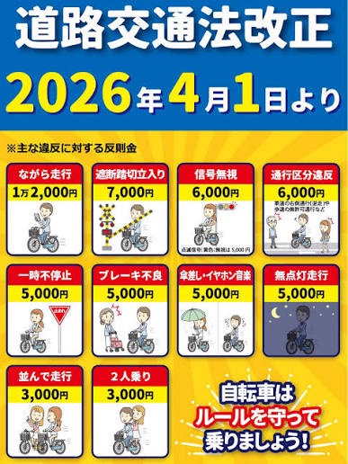 今回の改正で大きく変わるのが、自転車にも“青切符”が導入されることです。 16歳以上の方が対象で、違反内容によって反則金が科されます。