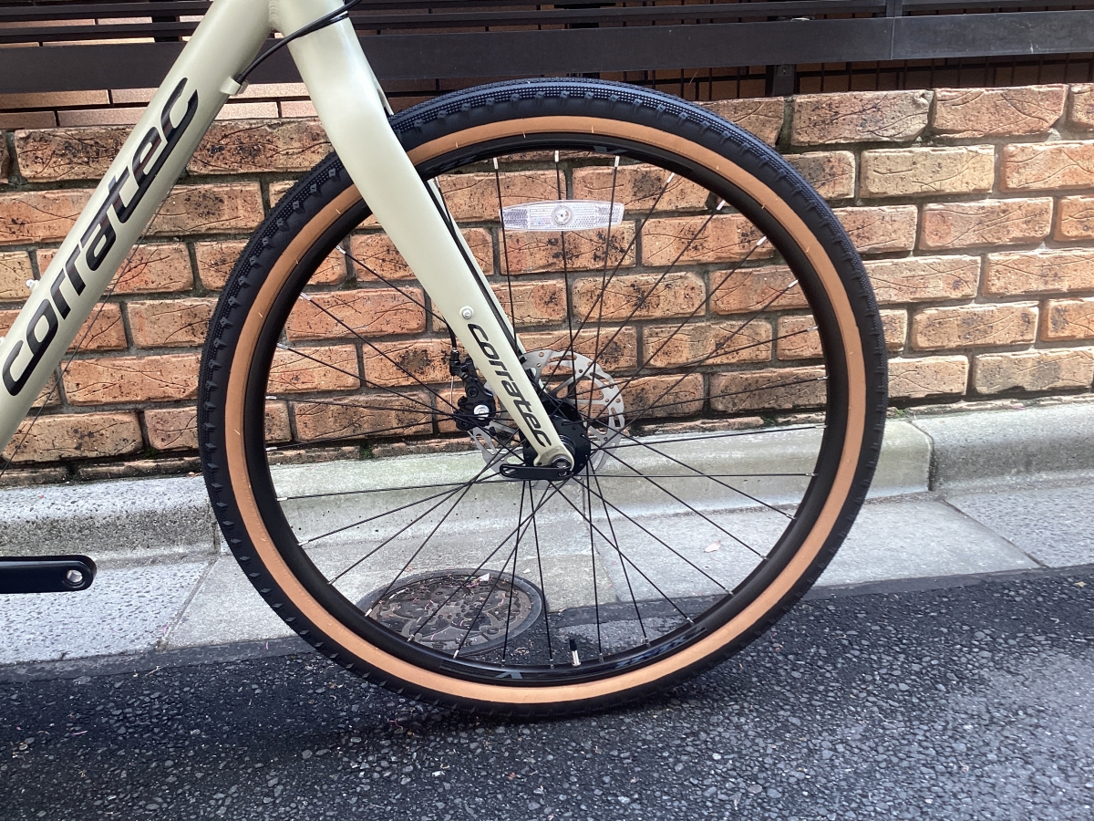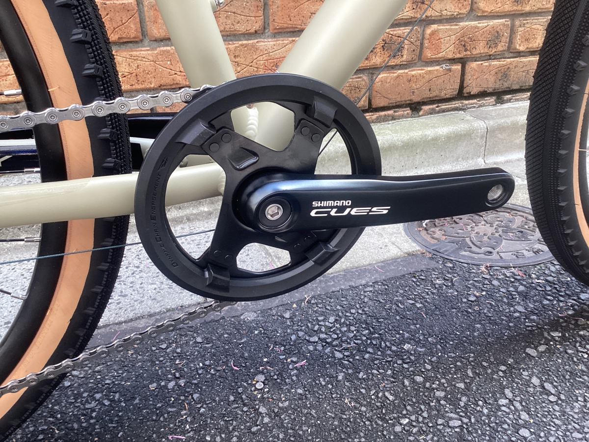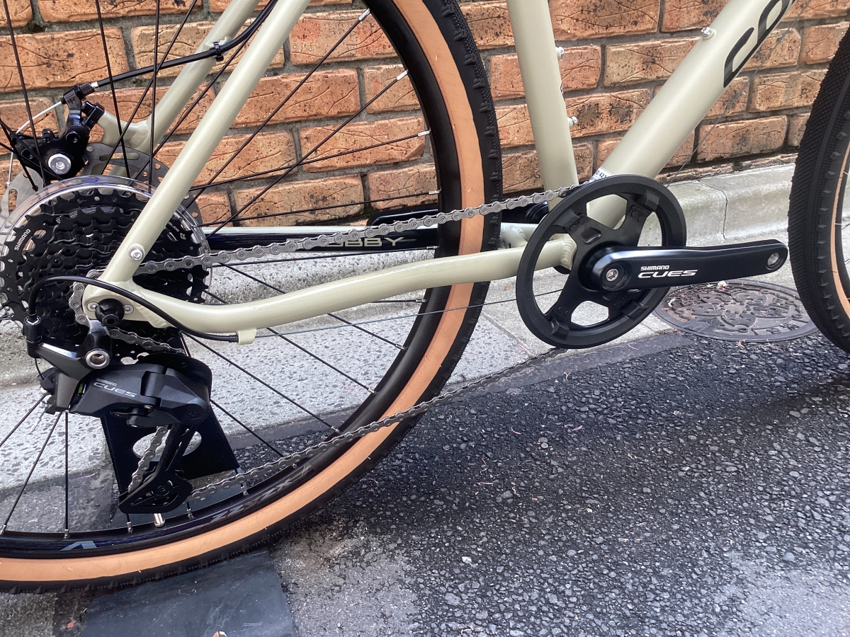 名前のとおり太めのタイヤを履いたフロントシングルのクロスバイク。タイヤは650B×47C。舗装路から荒れた路面まで幅広く対応します。ギアはシマノキューズ9速。毎日の使用にふまえ耐久性を重視したコンポーネントです。