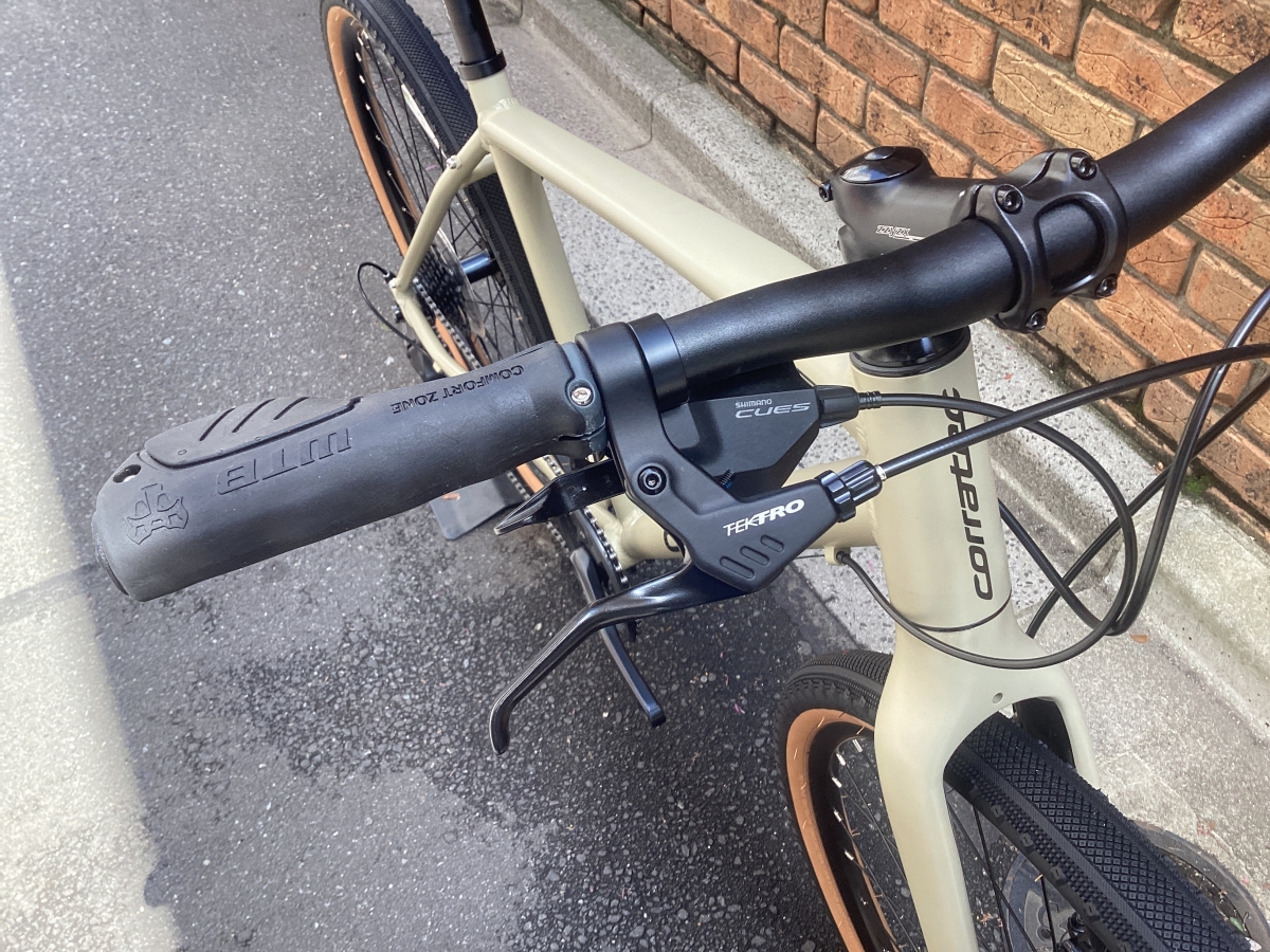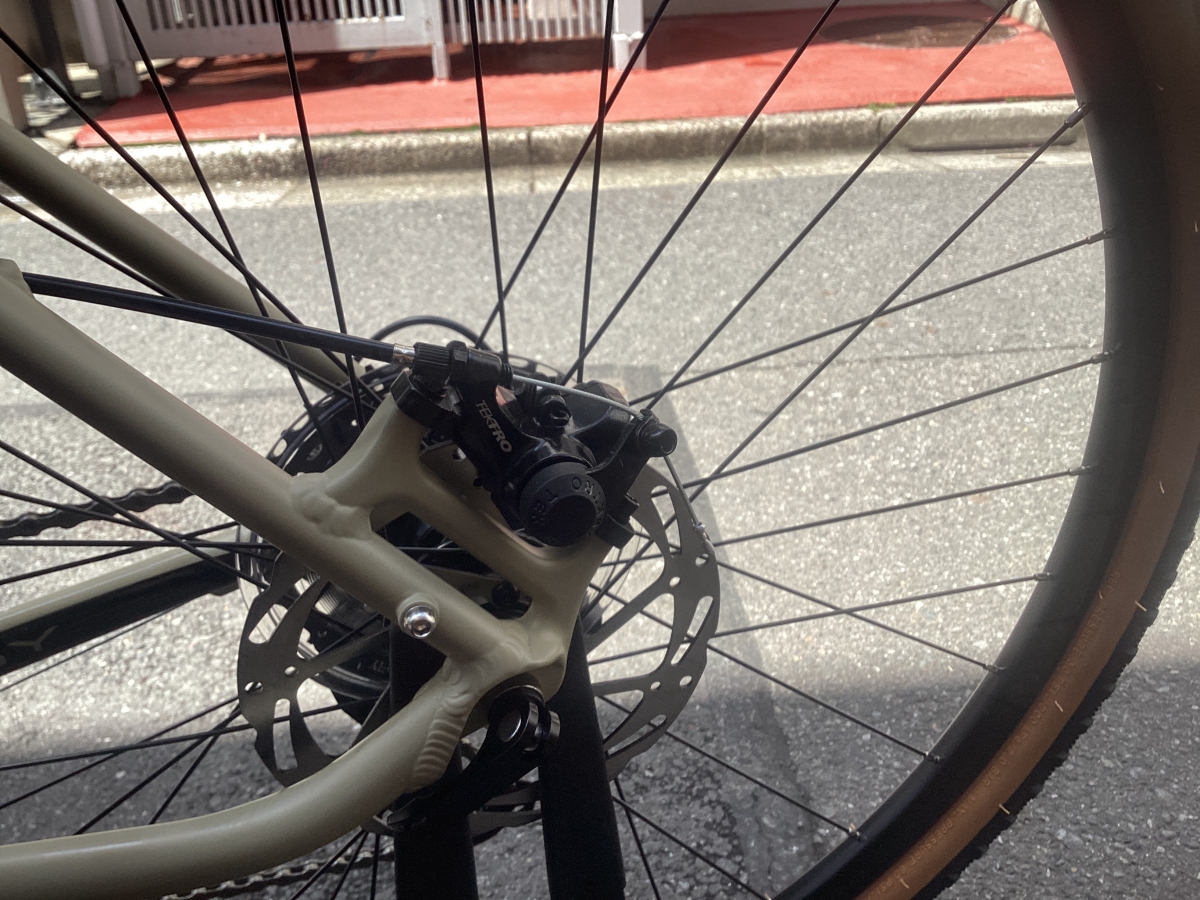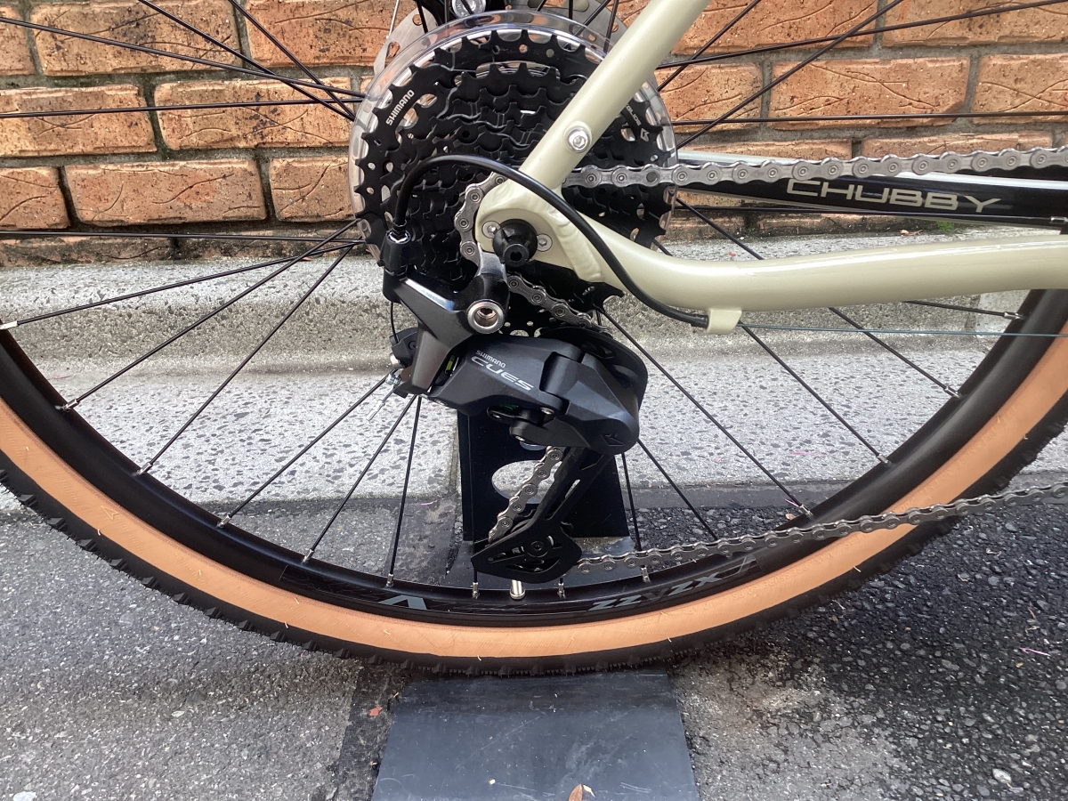 名前のとおり太めのタイヤを履いたフロントシングルのクロスバイク。タイヤは650B×47C。舗装路から荒れた路面まで幅広く対応します。ギアはシマノキューズ9速。毎日の使用にふまえ耐久性を重視したコンポーネントです。