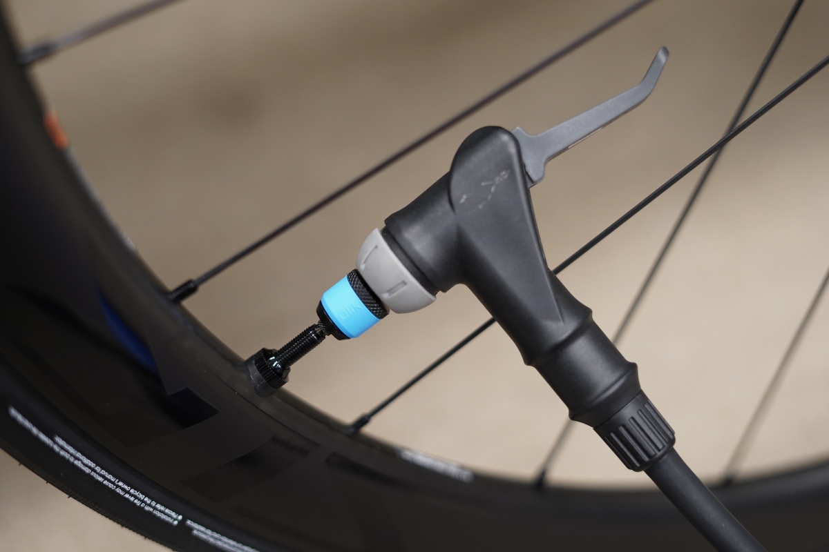このように既存のポンプにアダプターを装着して使う方法は、導入の手軽さという点で非常に優れています。しかし、CLIKアダプターが取り付けられている分、ポンプヘッドが大きくなってあまりスマートではないですし、ヘッドのレバーが持ち上がっているため、小径ホイールで使用する際スポークなどに干渉しやすいというデメリットは解消されません。