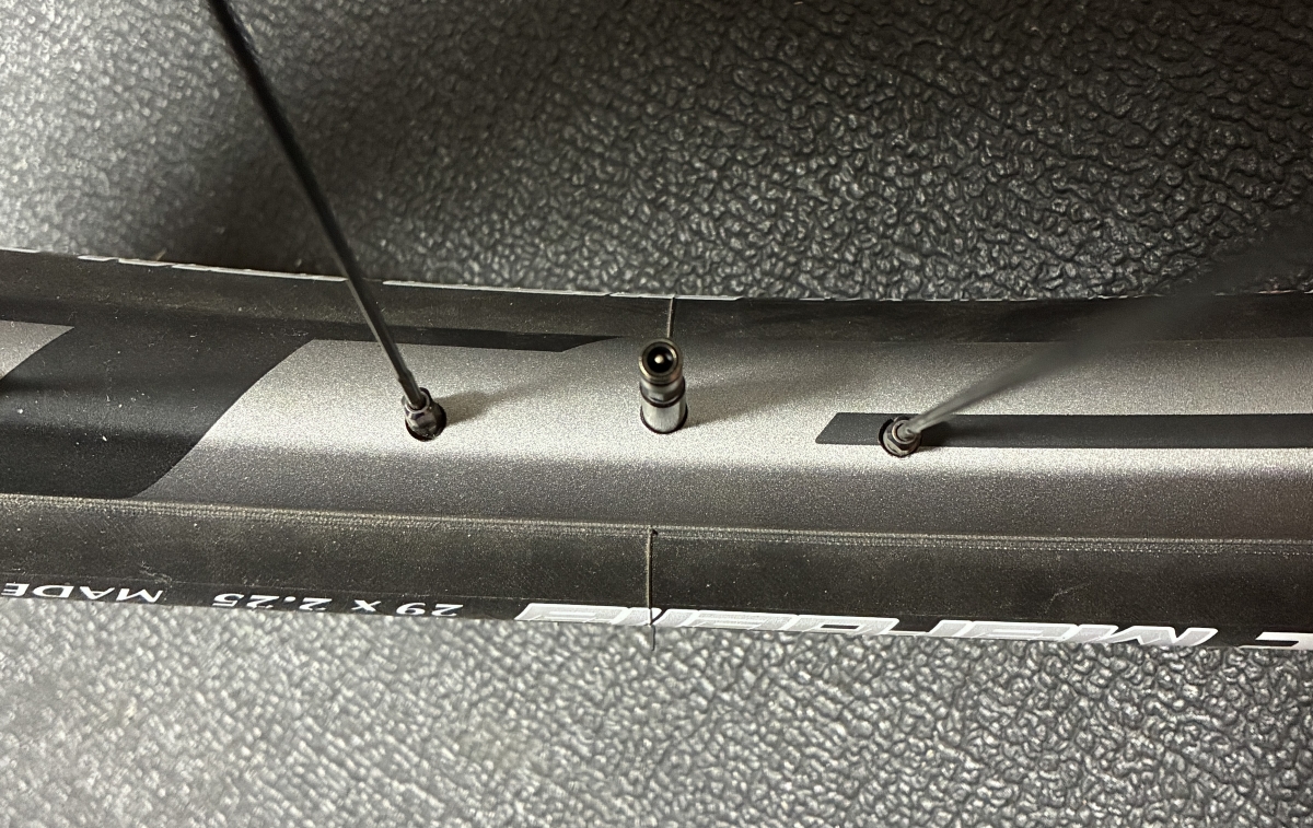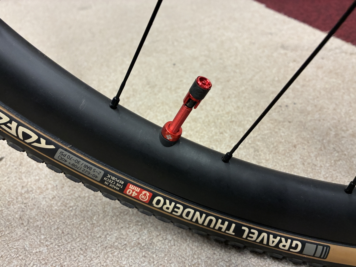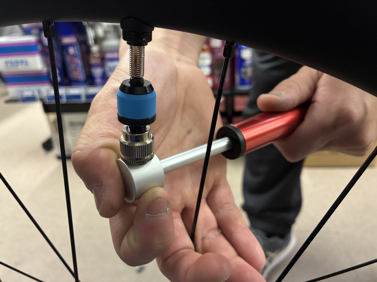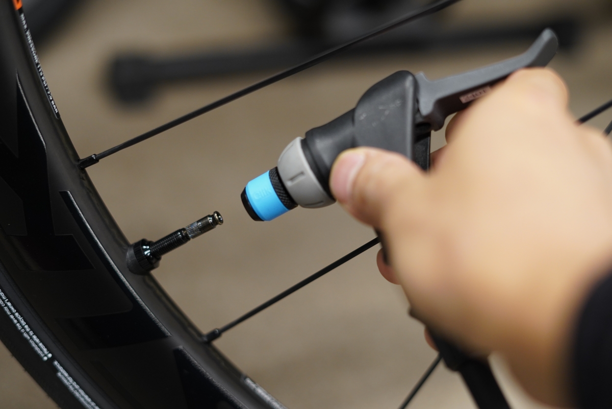 代わりにCLIKバルブを装着していくだけ。これも同梱されている専用のツールを使うとスムーズに作業できます。相性によってはCLIKバルブコアとバルブステムの間に微妙な隙間ができる場合がありますが、ある程度締まっていれば空気が漏れたりはしません。チューブレスバルブは締めすぎるとバルブが共回りし始めるので、しっかり取付したいならリムから外して作業した方がいいかもしれません。