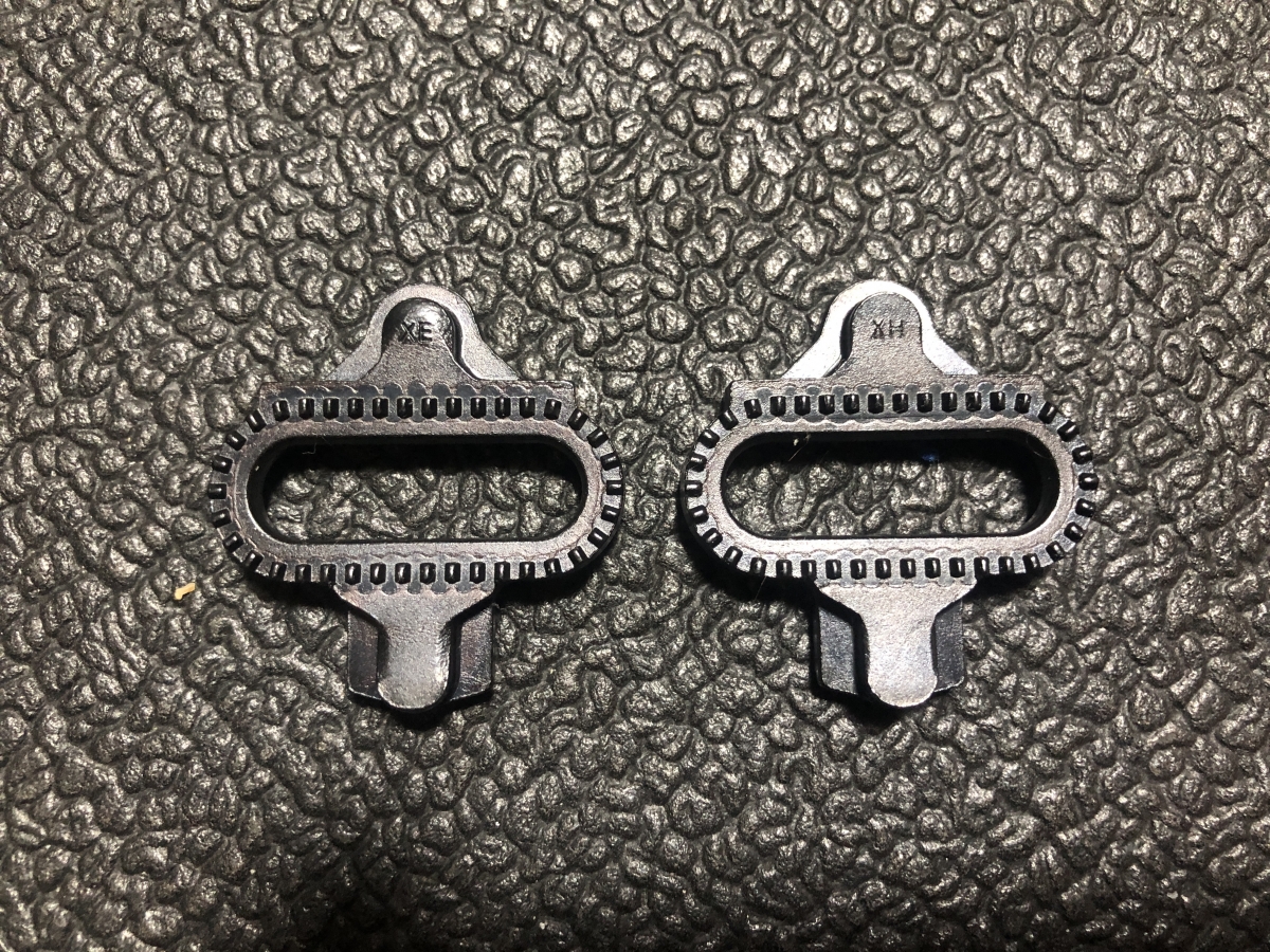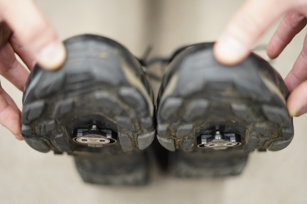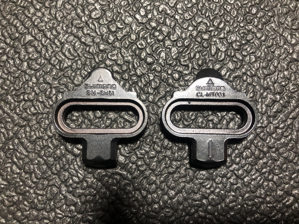 2つのクリートの違いを検証するため、右足にCL-MT001、左足にSM-SH51を使用するという、左右異型スタイルで走行してみました。画像では分かりにくいですが、新型はクリートの高さがわずかに薄くなっており、歩行時に地面に当たりにくくなっています。