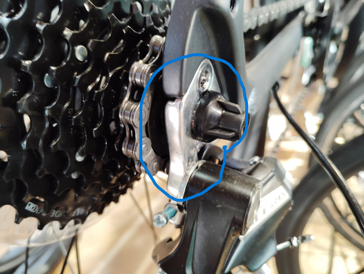 前述の通り、衝撃に弱いスポーツバイク。特にドライブトレイン側(ギアやチェーンがある方)に倒してしまった時に注意するべきところとしましては、ディレイラーハンガーと呼ばれるパーツが曲がっていないかのチェックです。