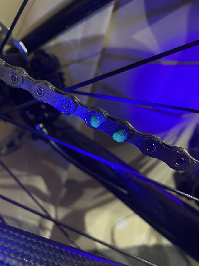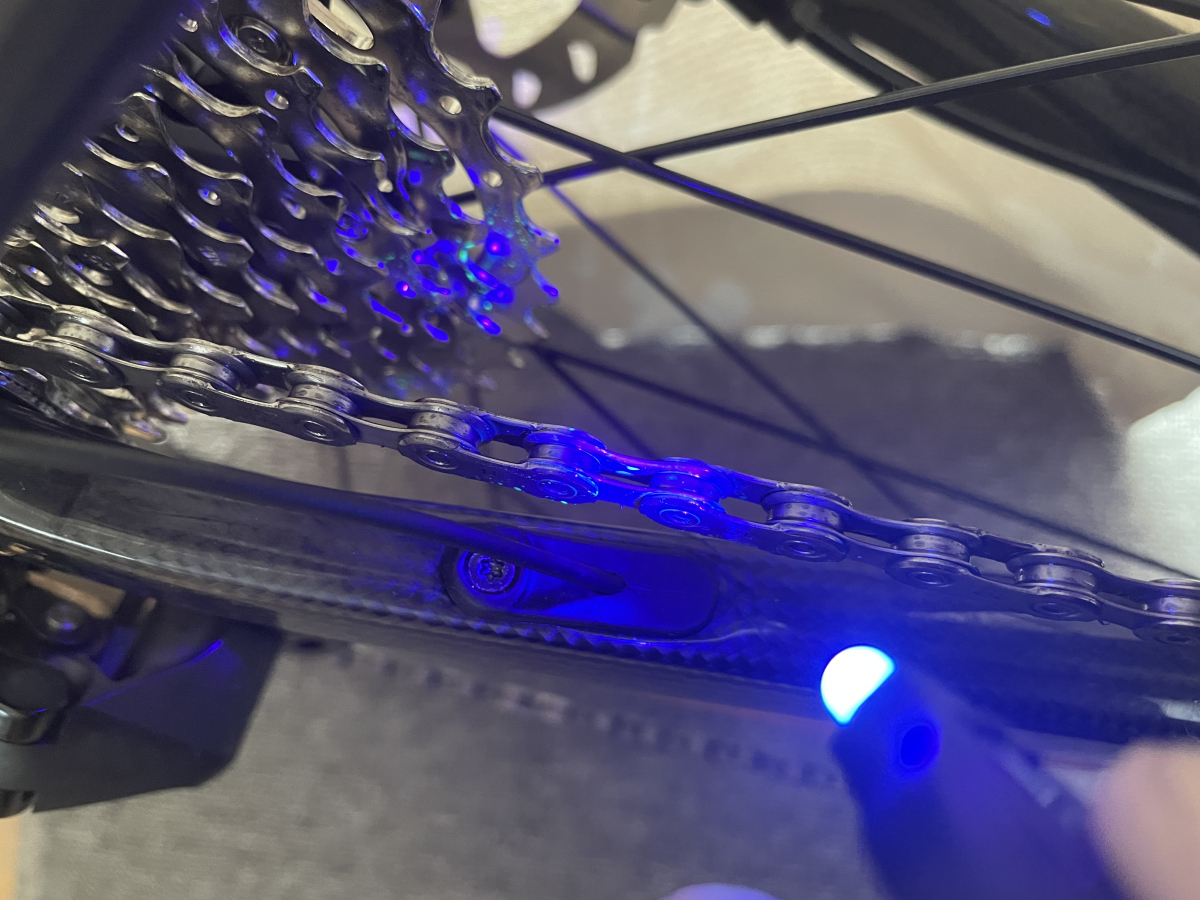 付属のUVライトを使用して、ルブを施工後、確実にチェーンの駒内部に浸透しているかどうかを確認することができます。