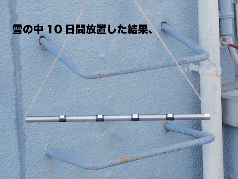 雪の降る中、5種類の防錆剤を同じパイプに塗布してセット。10日間放置した結果、左のHCB-1だけ全く錆びませんでした。