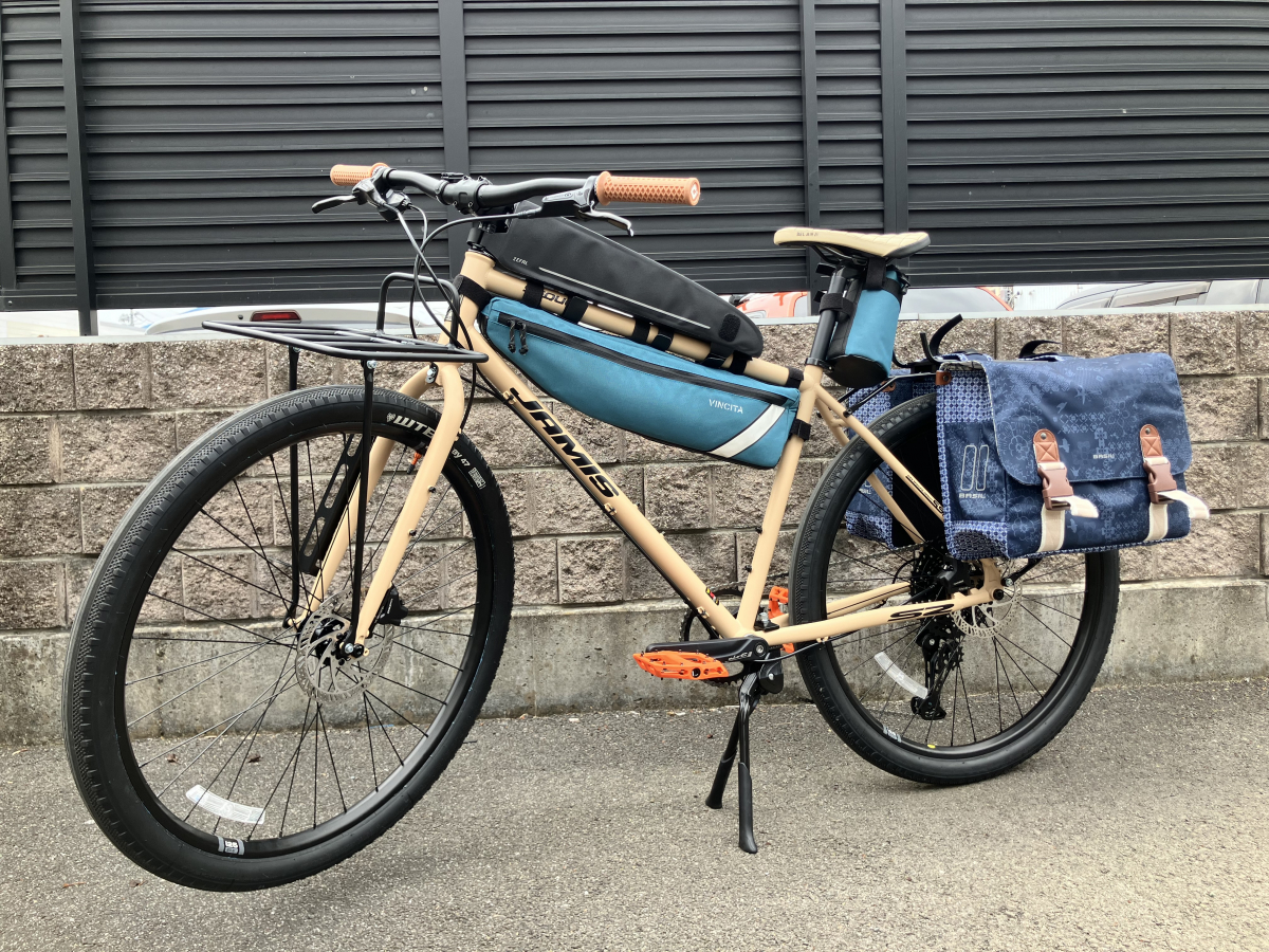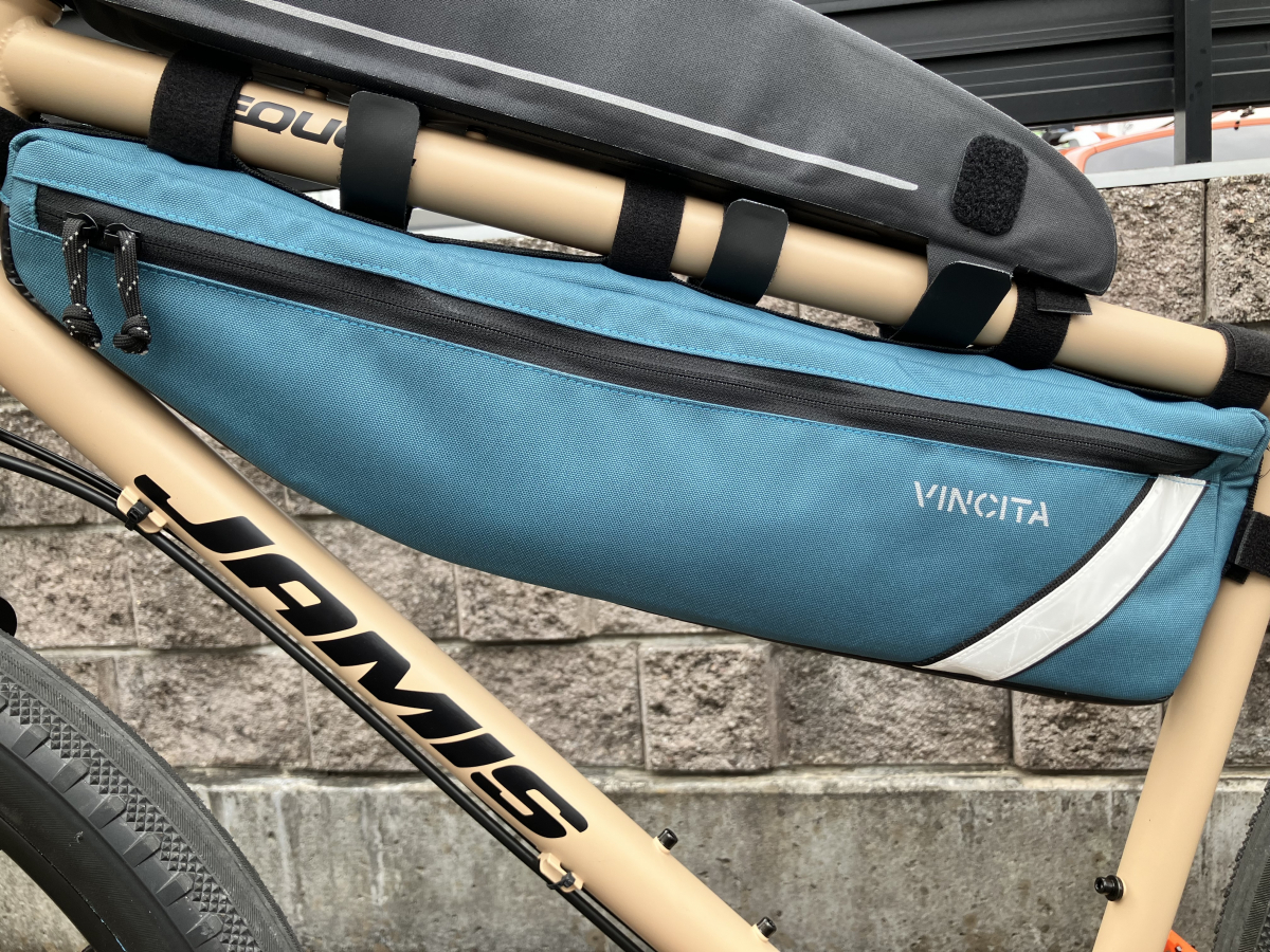 フレームバッグはなるべく大きくかつトップチューブ長と同じぐらいの長さのものを探してVINCITAというタイのサイクルバッグメーカーのものにしました。左右どちらからでも出し入れが出来るので使い勝手がよいです。