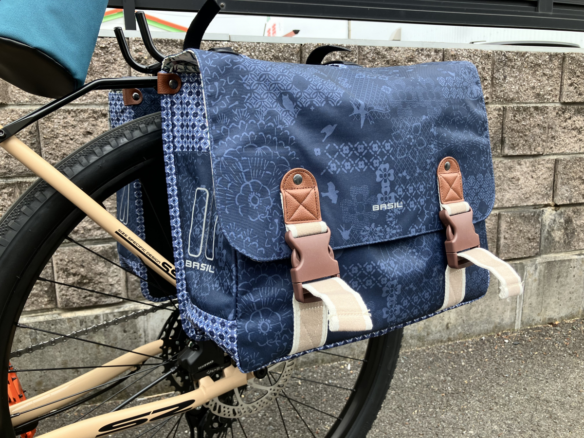 今回の主役ともいえるパニアバッグはBASILのボエムダブルバッグにしました。当初の考えではシングルパニアにしてその日の荷物の量に応じて一つにしたり二つにしたり臨機応変に対応できるようにしようと考えていましたが、中々好みのデザインのものに巡り合えず、BASILは大学生の頃愛用していたのもあって、こちらのボエムダブルバッグにしました。色合いもVINCITAのブルーに近い感じでいいのではないかと思っております。