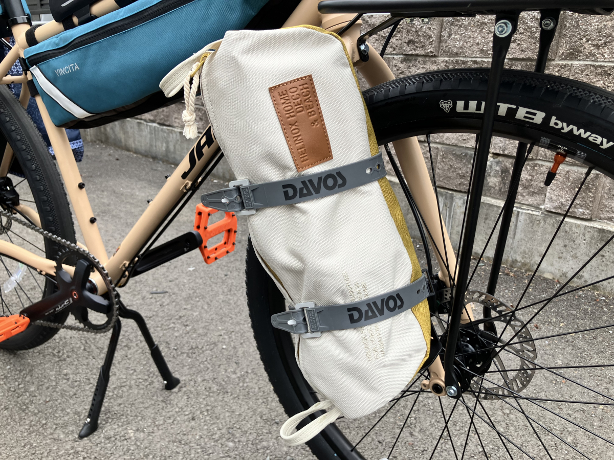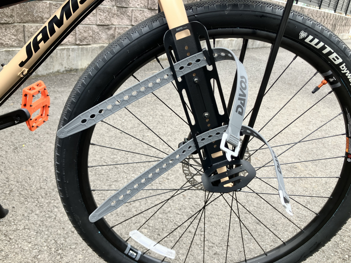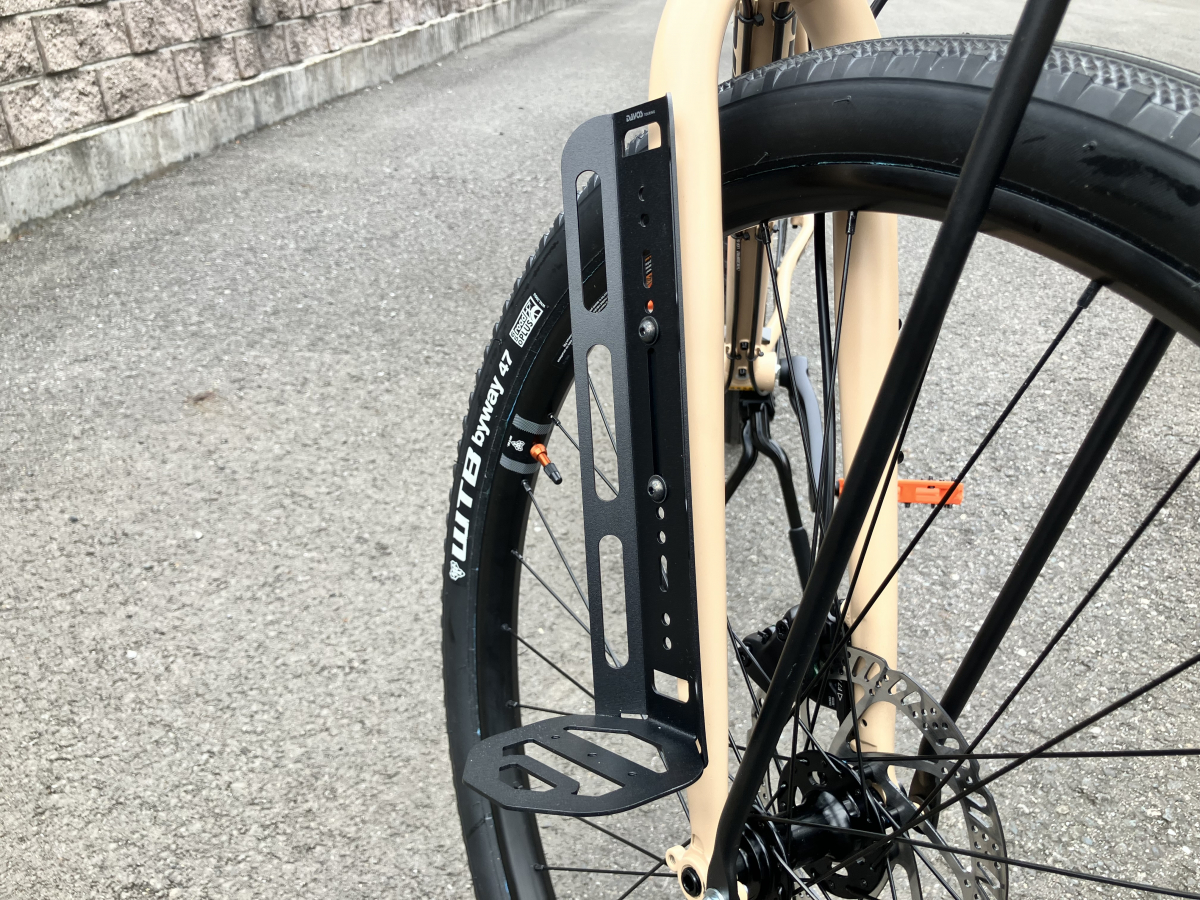 フォークにはDAVOSのGP-2 グラベルパッキングケージを取り付けました。決め手は適度な大きさと無骨な外観、そして底面がある点、FIXPLUSのベルトが付属する点です。