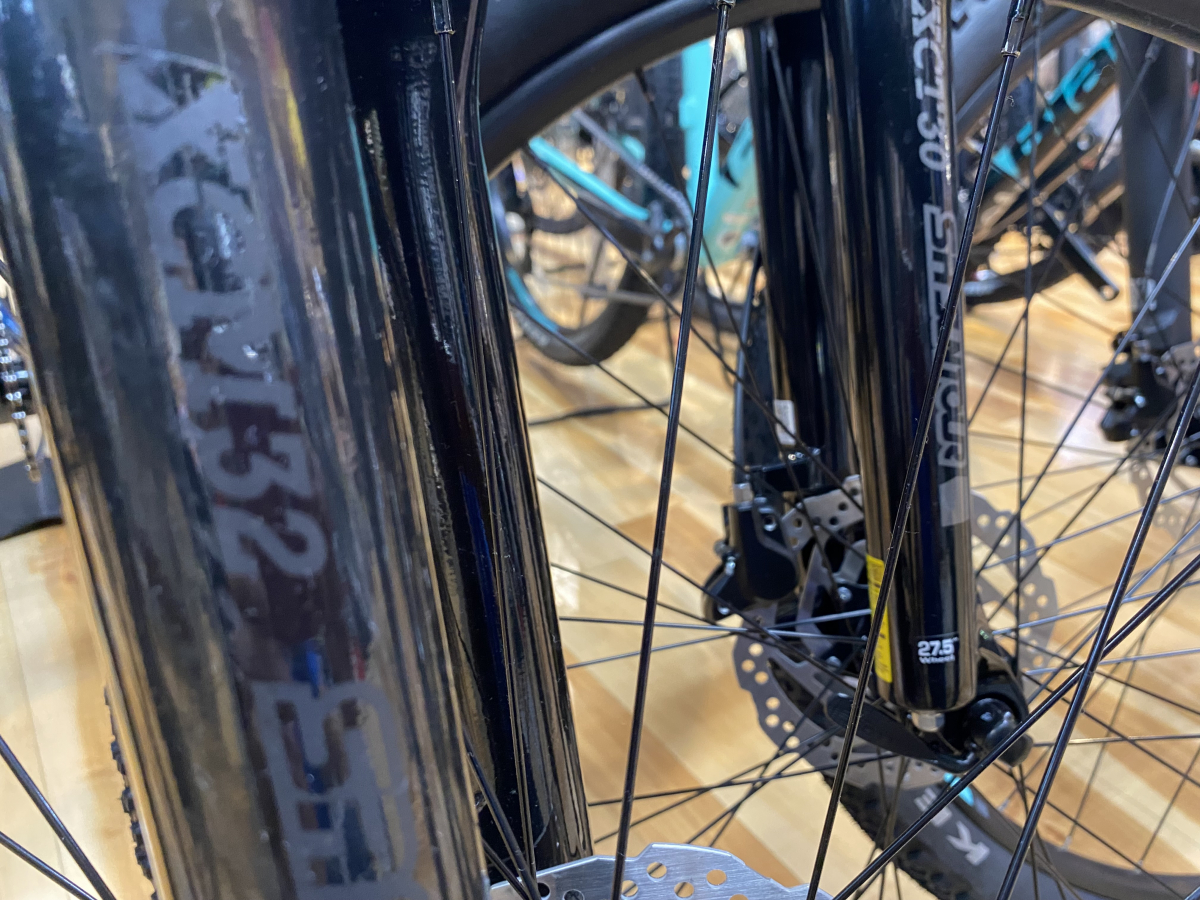 MTBで山に行くともっとも違いを感じるのがサスペンションです。Sports、CompともにSR SUNTOURのコイルタイプで、アッパーチューブの径が30mmか32mmかの違い。Eliteは有名ブランドロックショックスのJudy,動きはスムーズ。モデルによってちょっとづつグレードが上がってます。