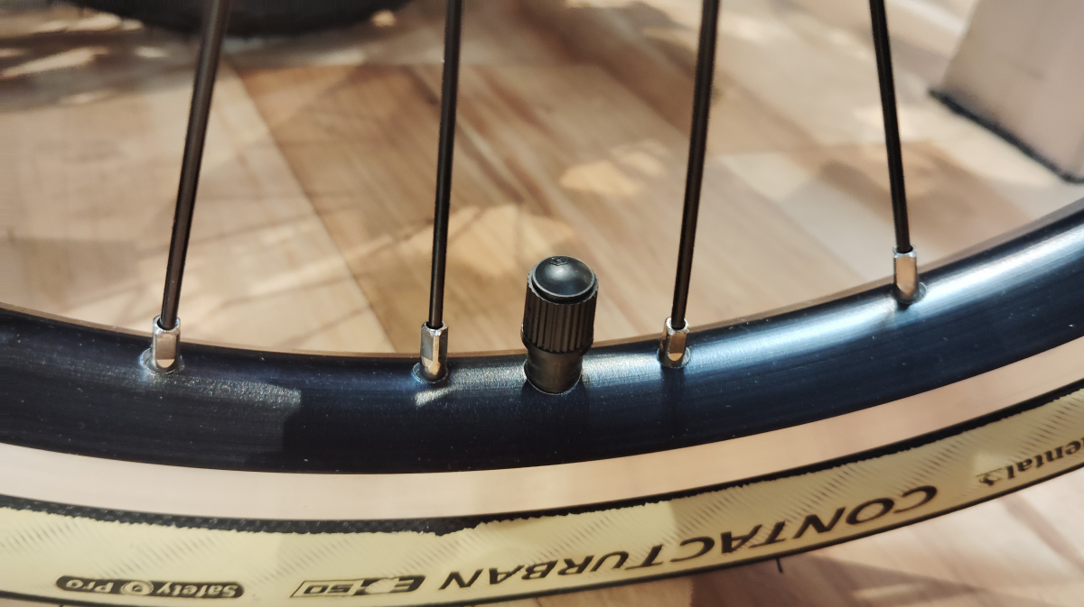 このホイールにこのチューブを使用すると、空気入れを差し込む部分がほとんど出ないため、空気が入れられません。これではいけませんので、長いバルブが付いているチューブを買う必要があります。裏を返せば、たくさん出ている分には使えるという考え方もできますが、出すぎているとアンバランスでカッコ悪いという方もいらっしゃるので、リムハイト+20mm程度の長さにしておくのが安牌だと思います。