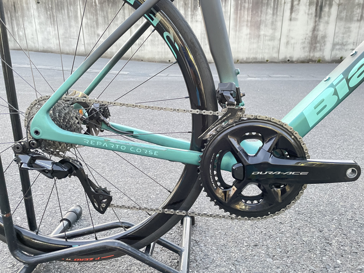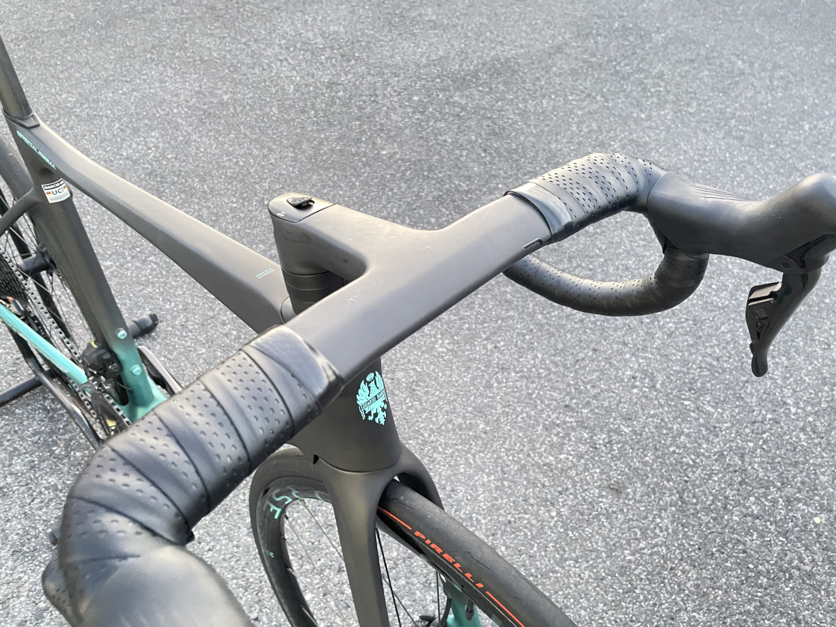 デザインは落ち着いたマットブラックをベースに、Bianchiの象徴であるチェレステカラーを差し色として採用。派手すぎることはなく、それでいて一目見ただけで「Bianchiの最上位モデル」と分かる、上品さと威圧感が共存したデザインに仕上がっています。