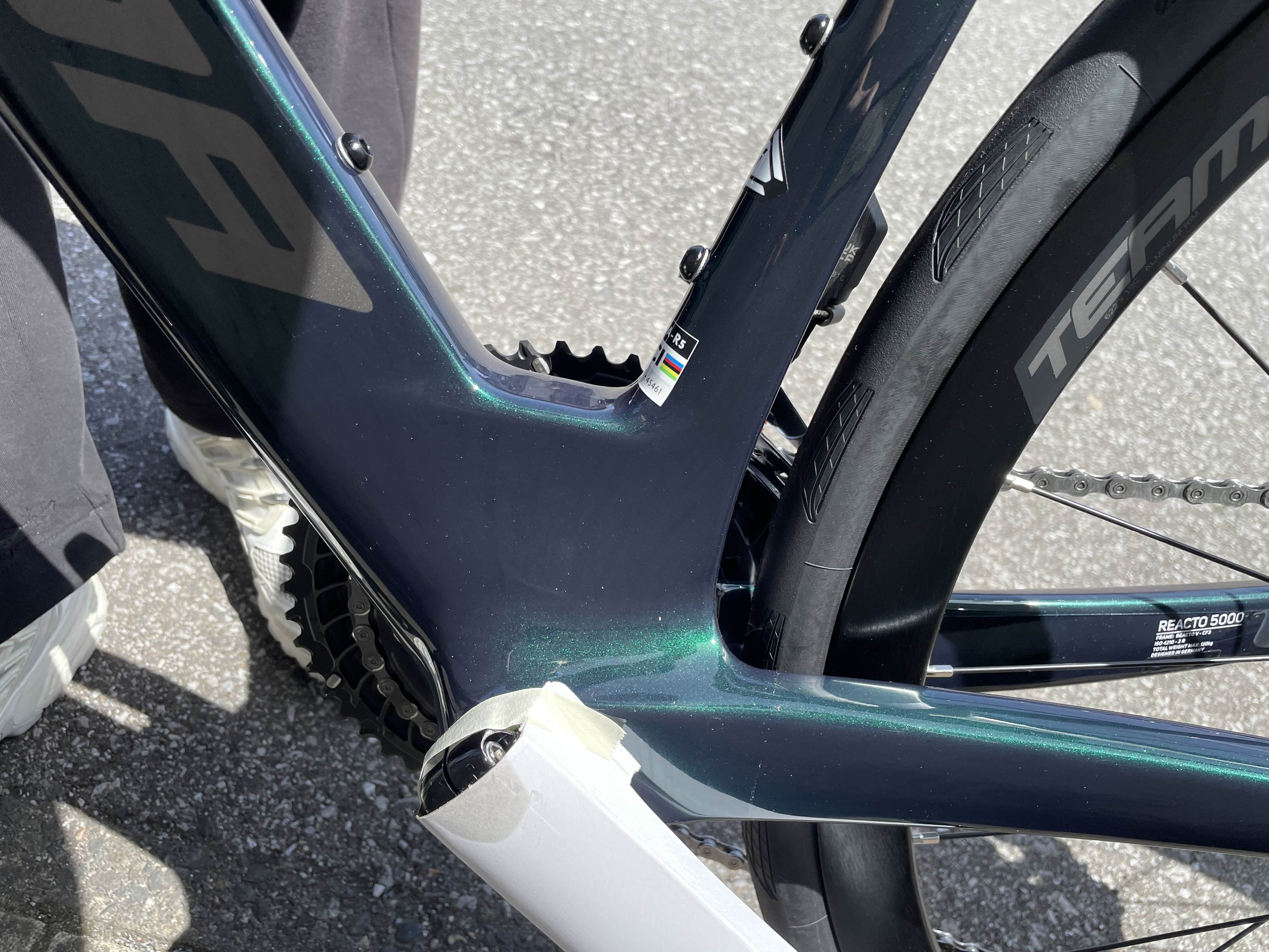 REACTO 5000はエアロロードでありながら、近年のトレンドに合わせた広めのタイヤクリアランスを確保しています。これにより、太めのタイヤを装着することで振動吸収性が向上し、荒れた路面やロングライドでも安定した走行が可能です。速さだけでなく、実際の使用シーンでの扱いやすさや快適性にも優れたバランスの良い1台となっています。