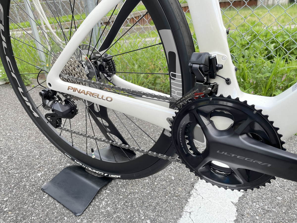 コンポーネントにはSHIMANO ULTEGRA Di2(12速)を搭載。電動変速ならではの「速さ・正確さ・静かさ」を兼ね備えており、あらゆる状況下でも安定した変速性能を発揮します。ボタン操作に対するレスポンスは非常に優れており、押した瞬間に変速が完了するダイレクトな操作感が特徴です。特にフロントディレイラーは構造が最適化されており、負荷がかかった状態でもスムーズに変速可能。レース中のペース変化や登坂時でもストレスを感じにくく、ライダーは走りに集中できます。さらに、電子制御によって変速ミスを防ぎ、長距離ライドや疲労時でも安定した操作性を維持できる点も大きな魅力です。