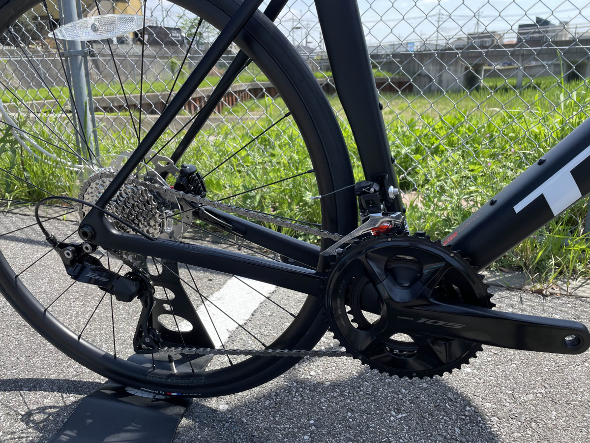 コンポーネントにはSHIMANO 105(機械式)12速を搭載しています。変速性能は非常に高く、軽い操作で確実かつスムーズにギアチェンジが可能です。12速化によりギアのつながりが細かくなり、ケイデンスを維持しやすいため、平坦路・登坂・下りといったあらゆるシーンで安定した走行が可能です。また、油圧ディスクブレーキの採用により、少ない力でもしっかりとした制動力を発揮し、雨天時や長距離の下り坂でも安心してコントロールすることができます。操作性・信頼性ともに優れており、初心者から上級者まで幅広く満足できる仕様となっています。