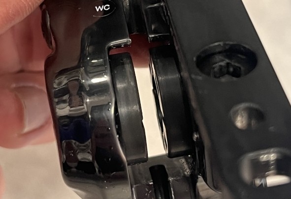 パッドの擦れた後が外周側にはみ出している様に見えてしまうのですが、パッドの当たりはきっちりと収まっています。SHIMANOよりも制動面の幅が広いのと、純正パッドの下が大きく面取りされているので内周側には跡が付いていません。