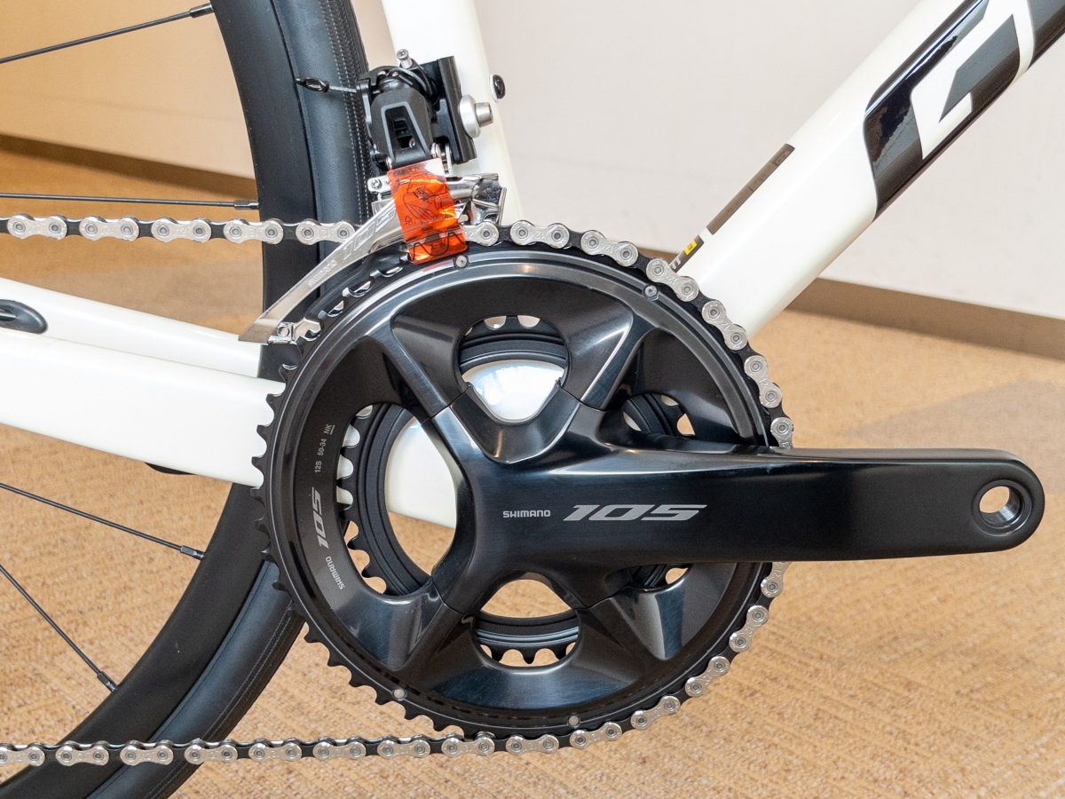 現行の105のリアディレイラーRD-R7100は最大36Tまで対応しています。こちらのバイクも11-36Tがアッセンブリーされおり、軽いギアでヒルクライムが苦手な方でも登りが楽になります!