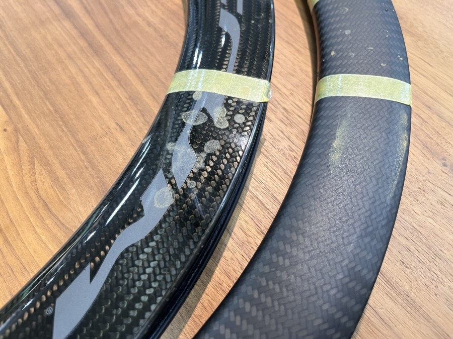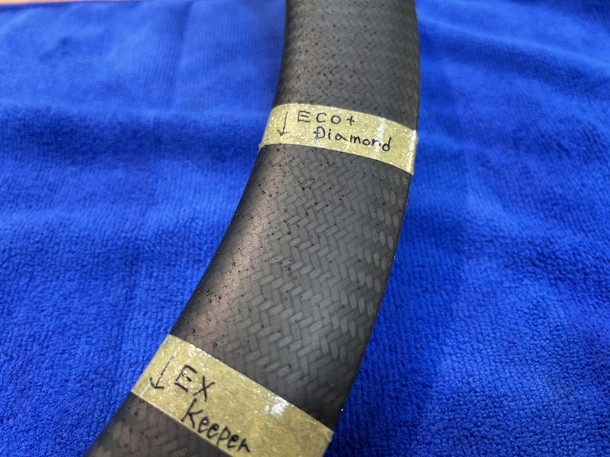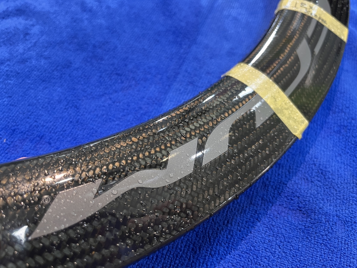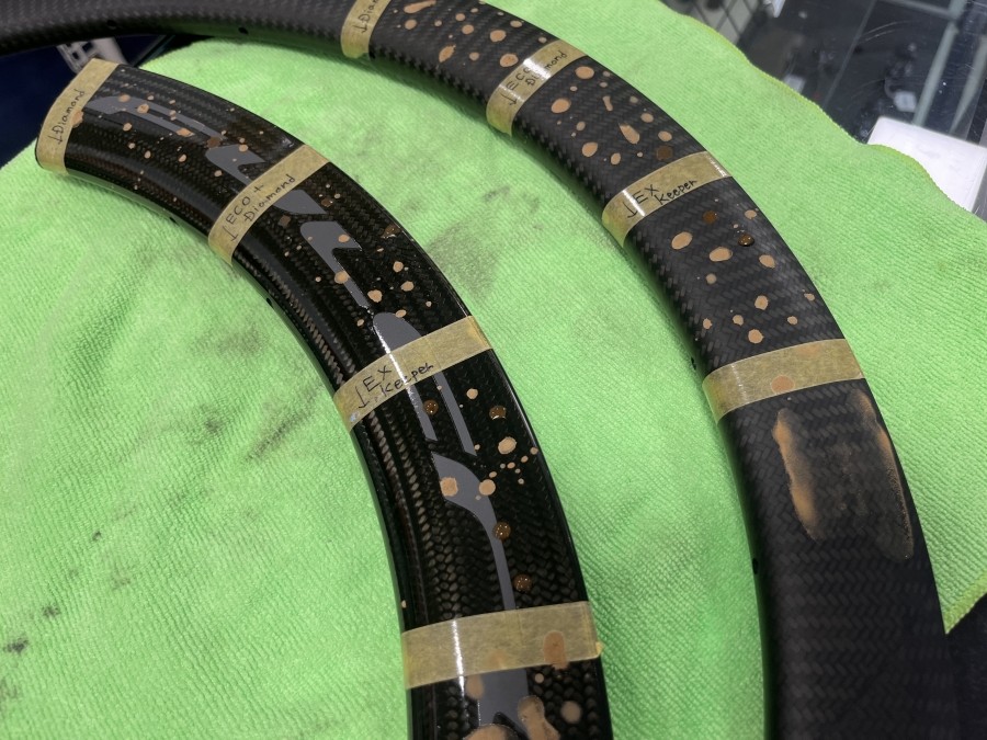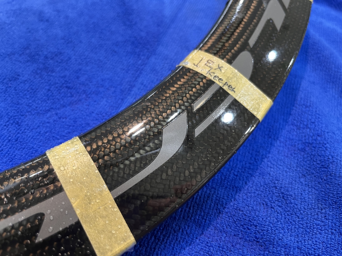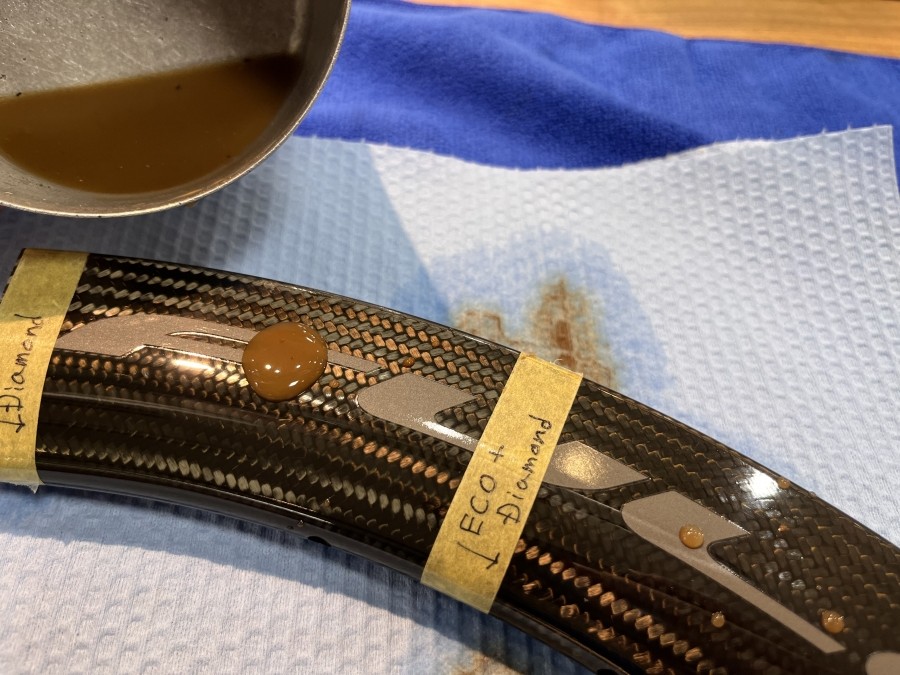 コーティングを施工した自転車を汚せば効果が分かるのですが、せっかくなので対比実験をしようと思います。用意したのはカーボンリムの切れ端。マスキングテープで区切って3種類のコーティングを施工しました。