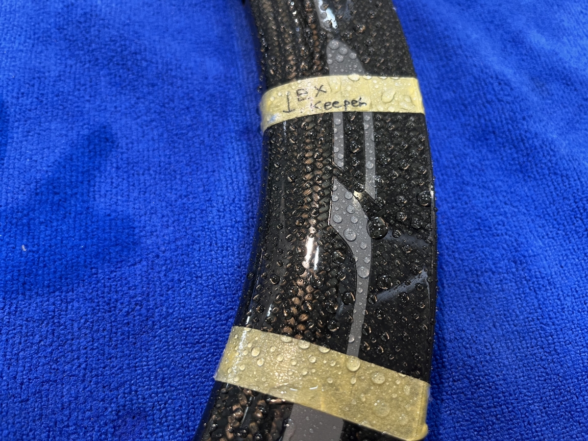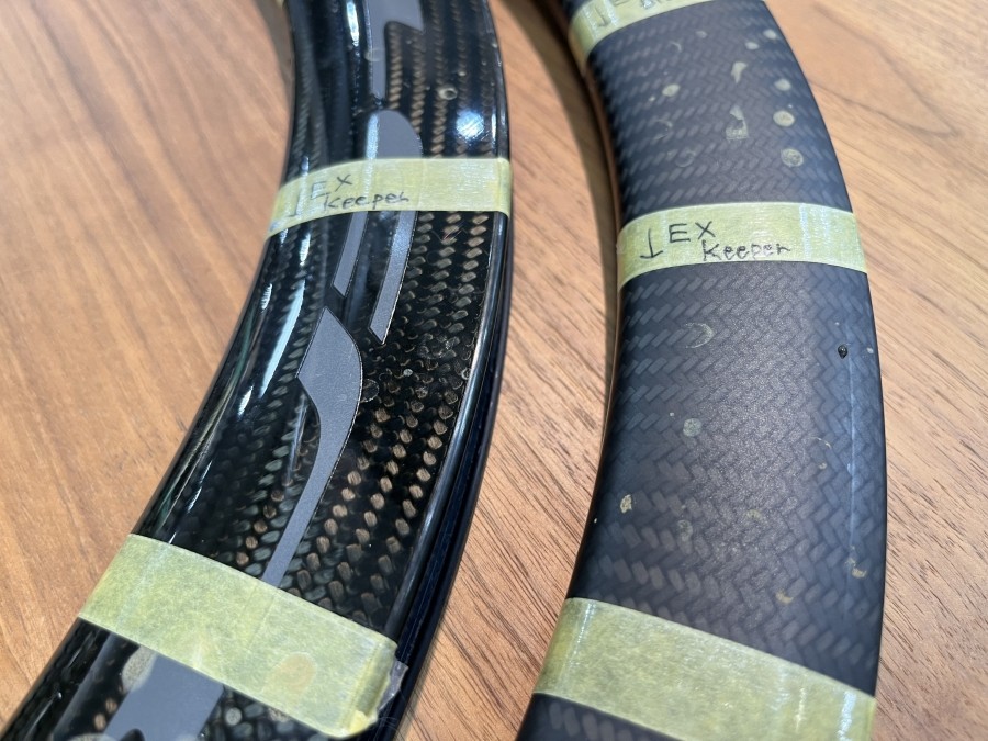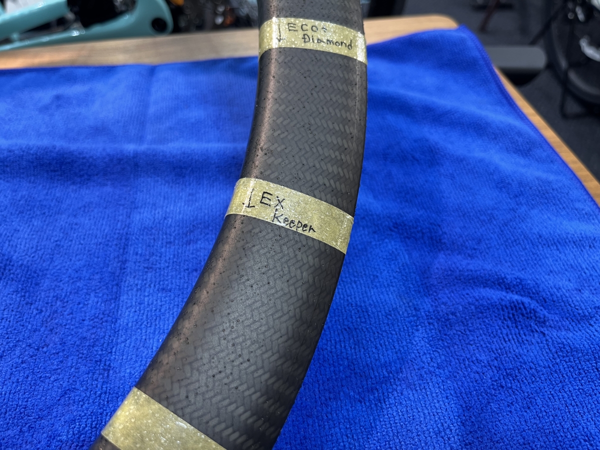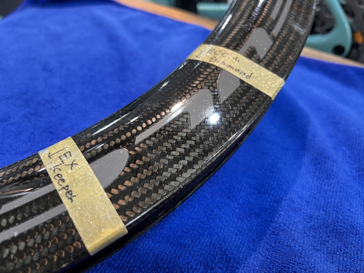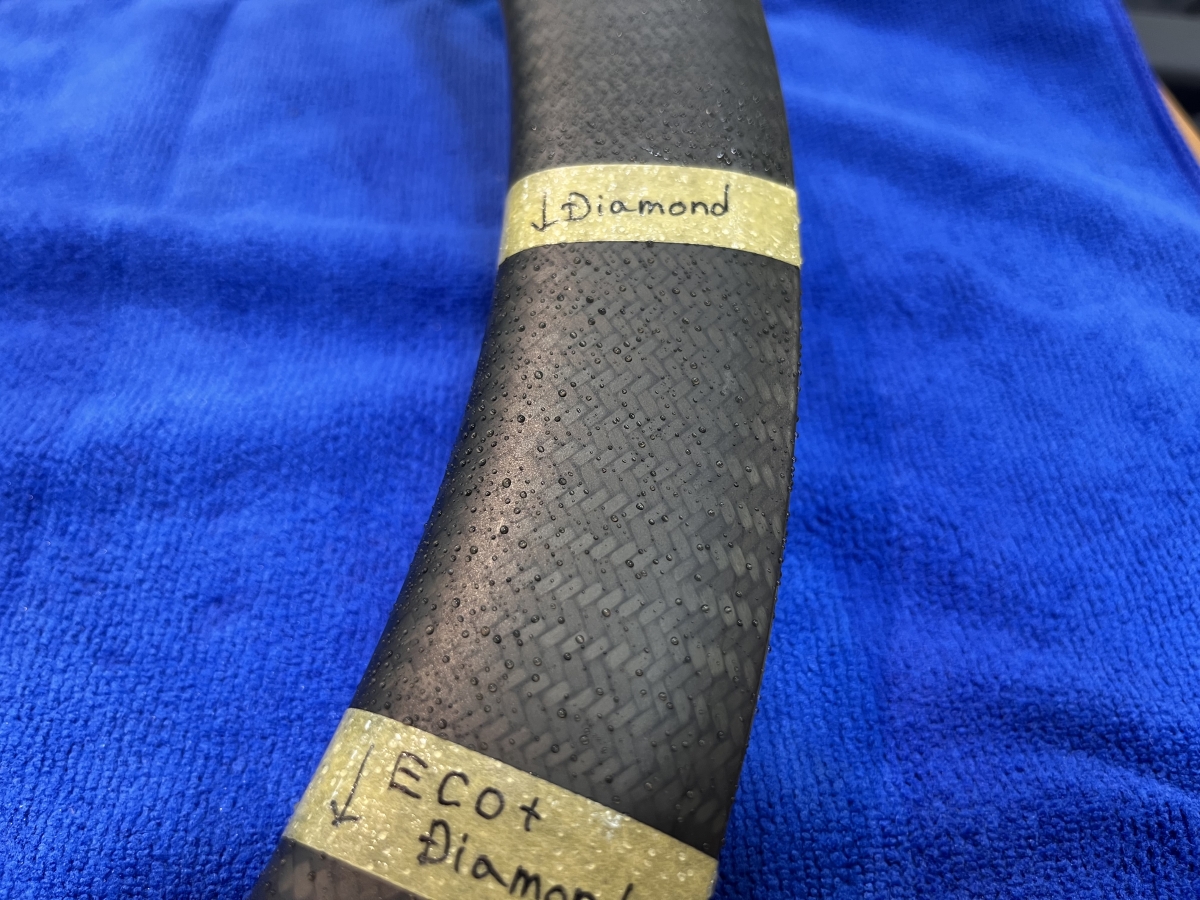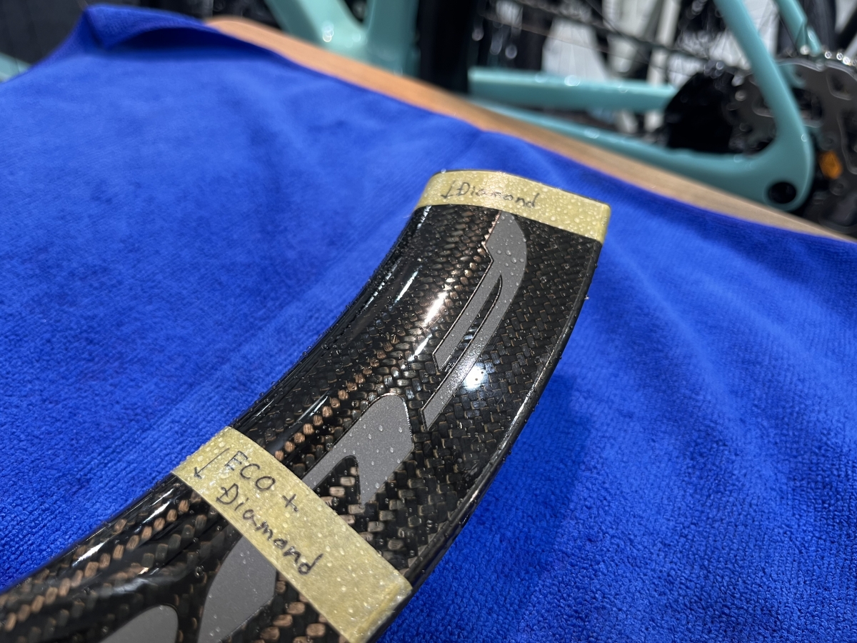 コーティングを施工した自転車を汚せば効果が分かるのですが、せっかくなので対比実験をしようと思います。用意したのはカーボンリムの切れ端。マスキングテープで区切って3種類のコーティングを施工しました。