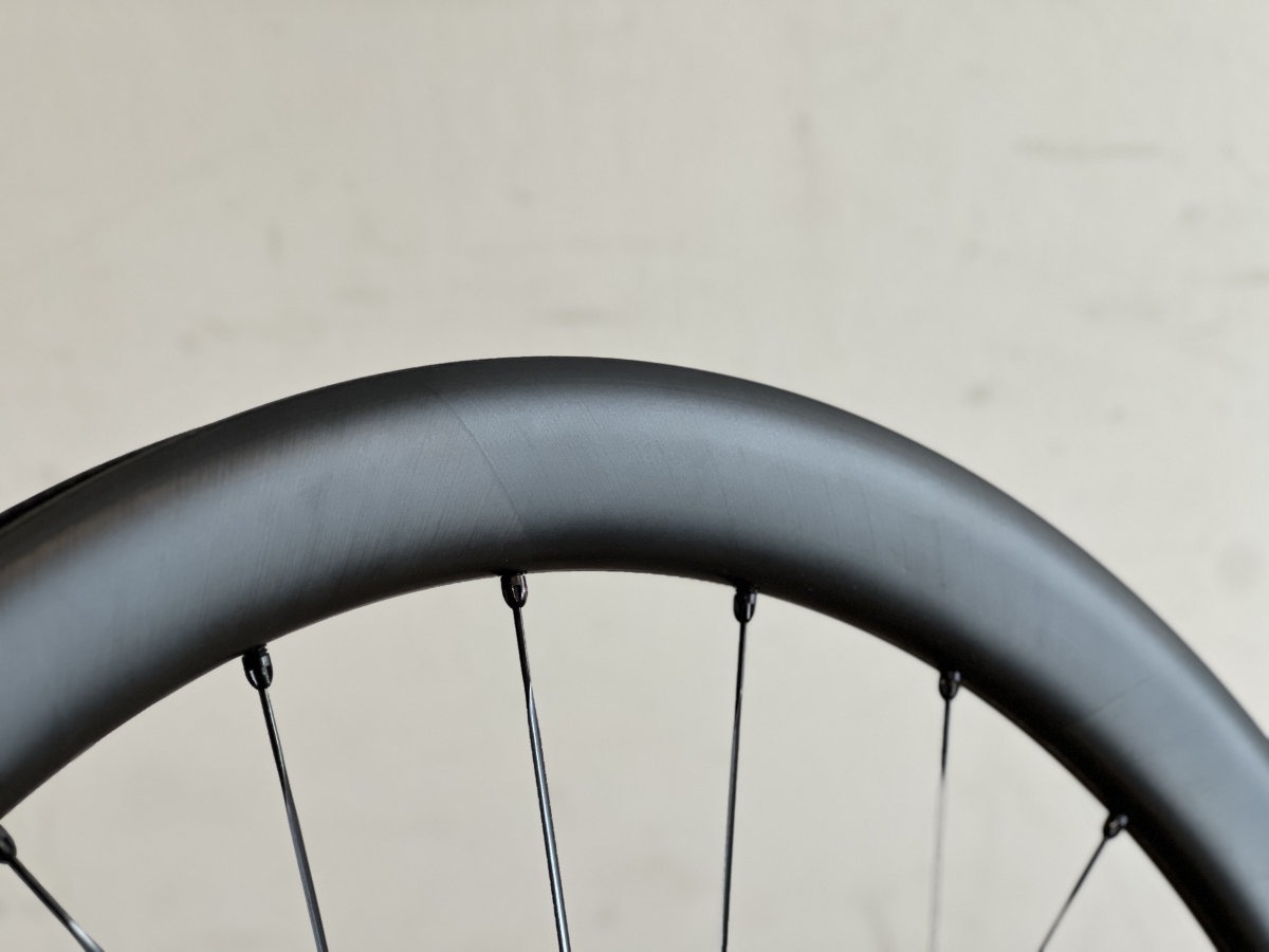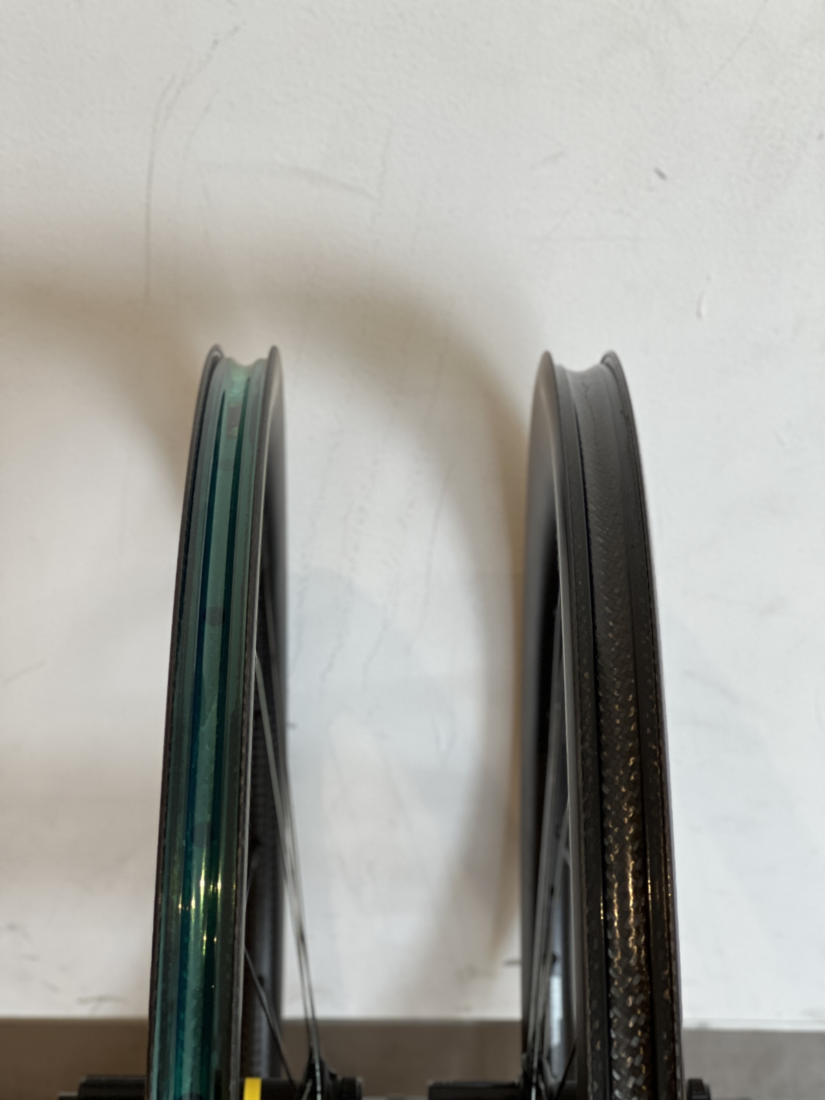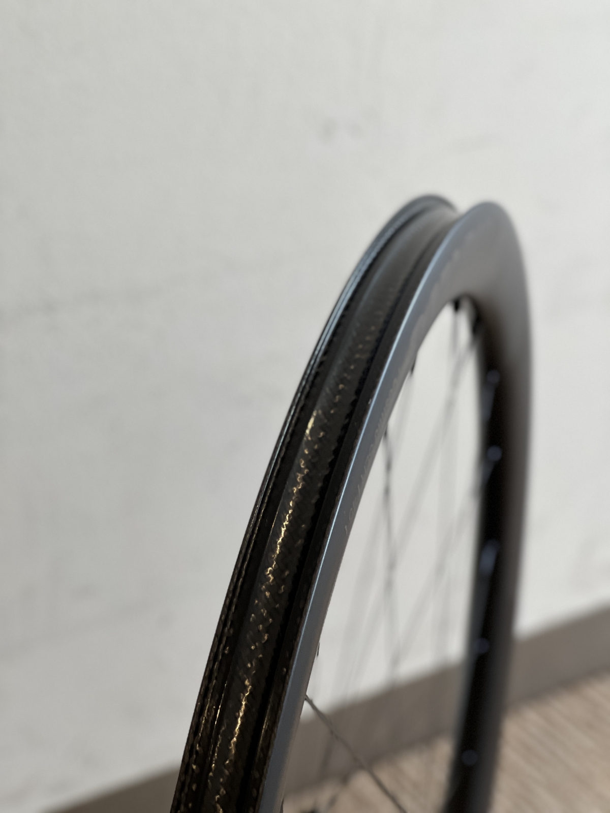 内側はカーボンの織目が見える様になっていますが、外側はUDカーボン仕上げとなっており高級感がありますね。内幅も23mmとワイド化しているので19mmのホイールと比べると結構違います。