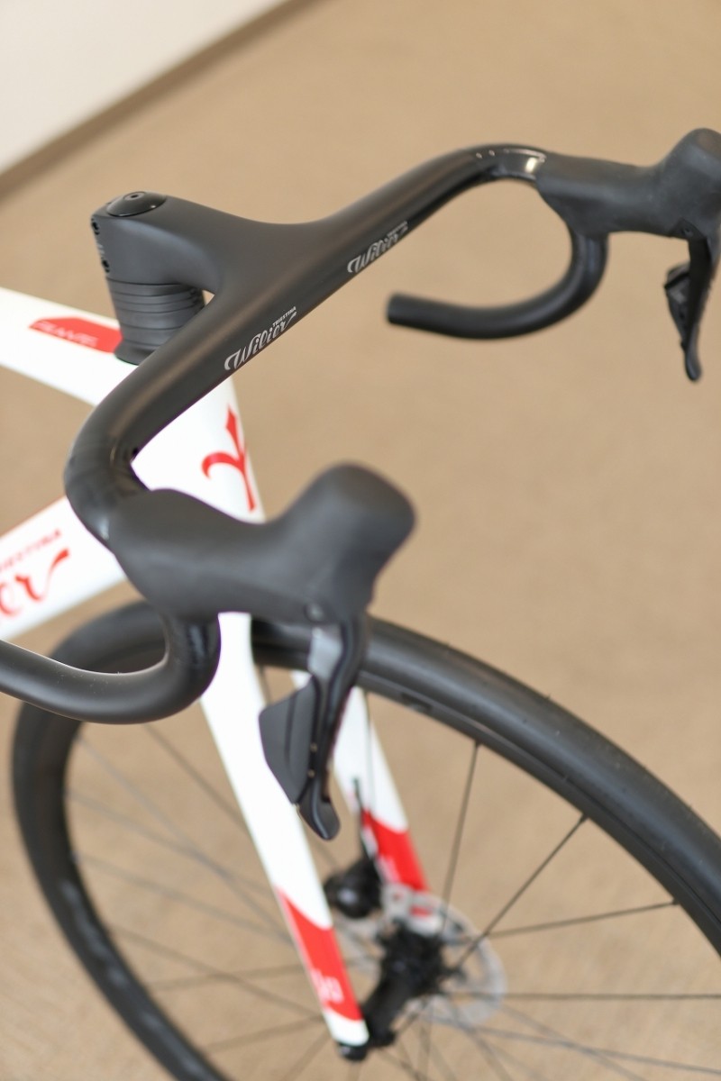 標準で付いてくるアルミ製別体ハンドル・ステムよりも軽量でスマートなルックスとなります。