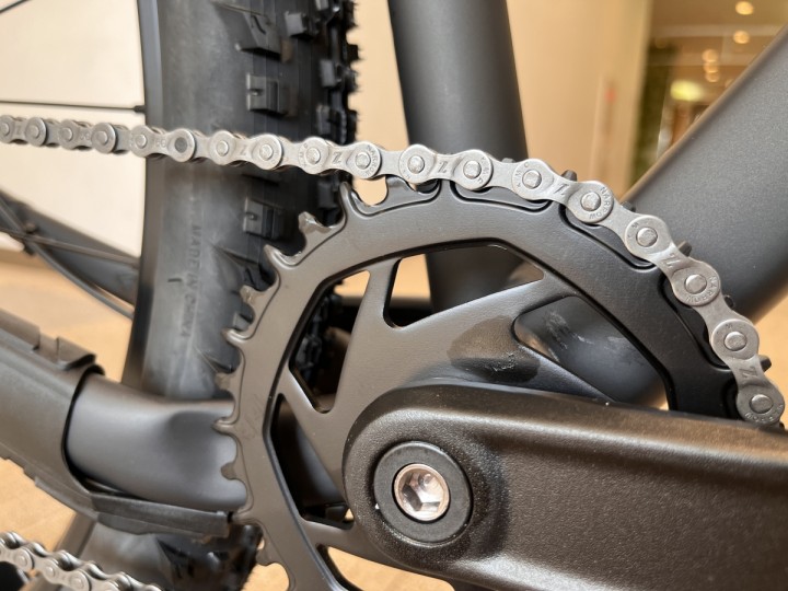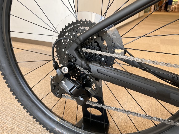 MARLIN 4のドライブトレイン(ギア周り)はフロントシングル。その名の通り、前のギアが一枚のみの構成になっており、代わりに後ろがワイドなギアレンジ。