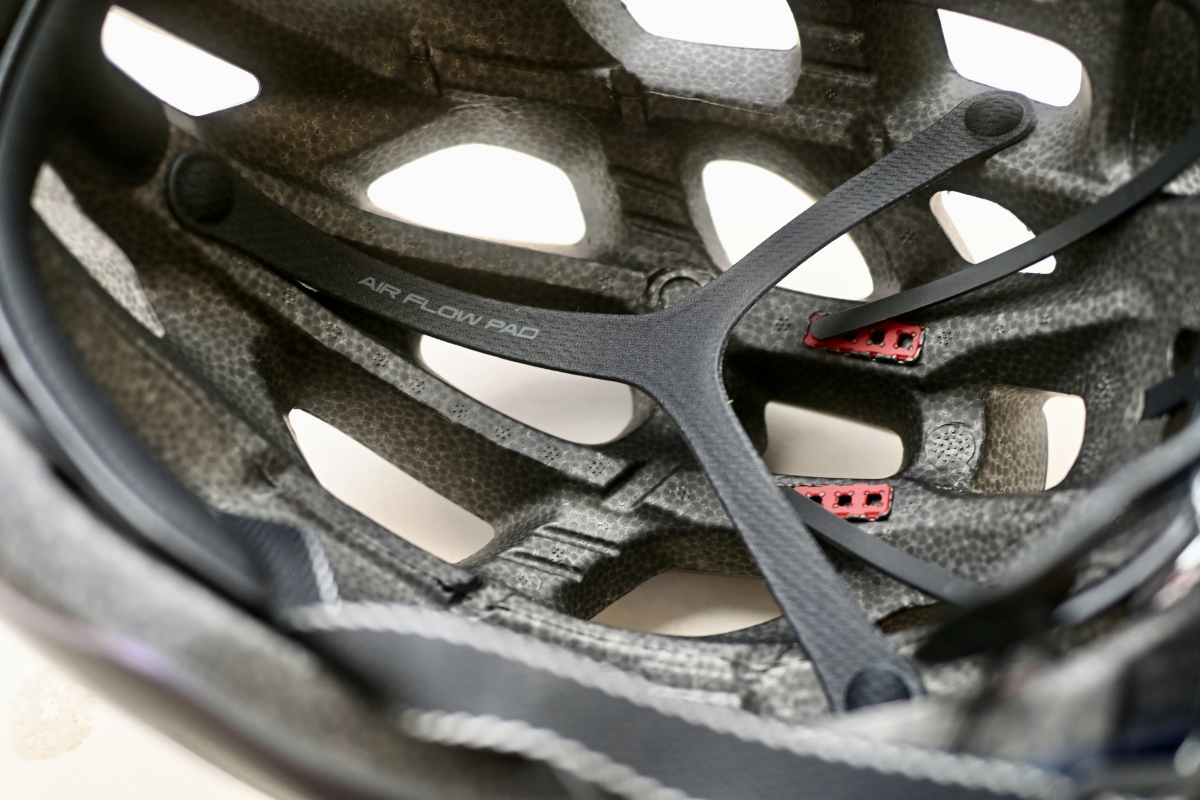 またエアーフローパッドなるものが付いているおかげで頭頂部とヘルメットの間に空間が生まれます。これのおかげでヘルメット前面から取り入れた風をヘルメットの内側を通しながら後方へと抜けていく設計になっています。夏場は全然涼しさが違います。冬場は寒そうと思われた方もご安心ください。ウィンターインナーパッドも付属しているので寒い時期も安心です。