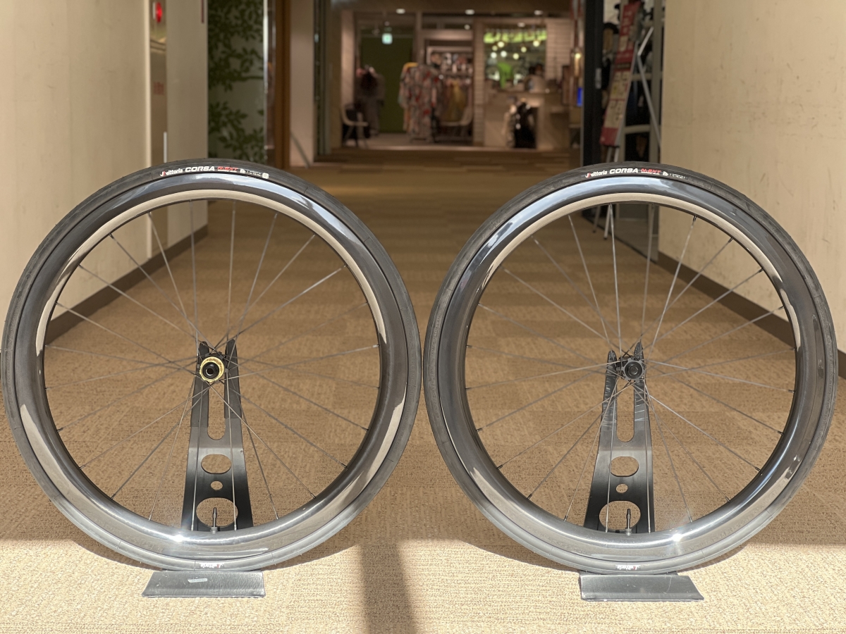 1セット目はタイヤにVittoriaのミドルグレードCORSA N.EXTの28cをチューブレス仕様にした装着したANTARESカーボンホイール。チューブレスで運用したい方、試してみたい方はこちらを是非試乗してみてください。